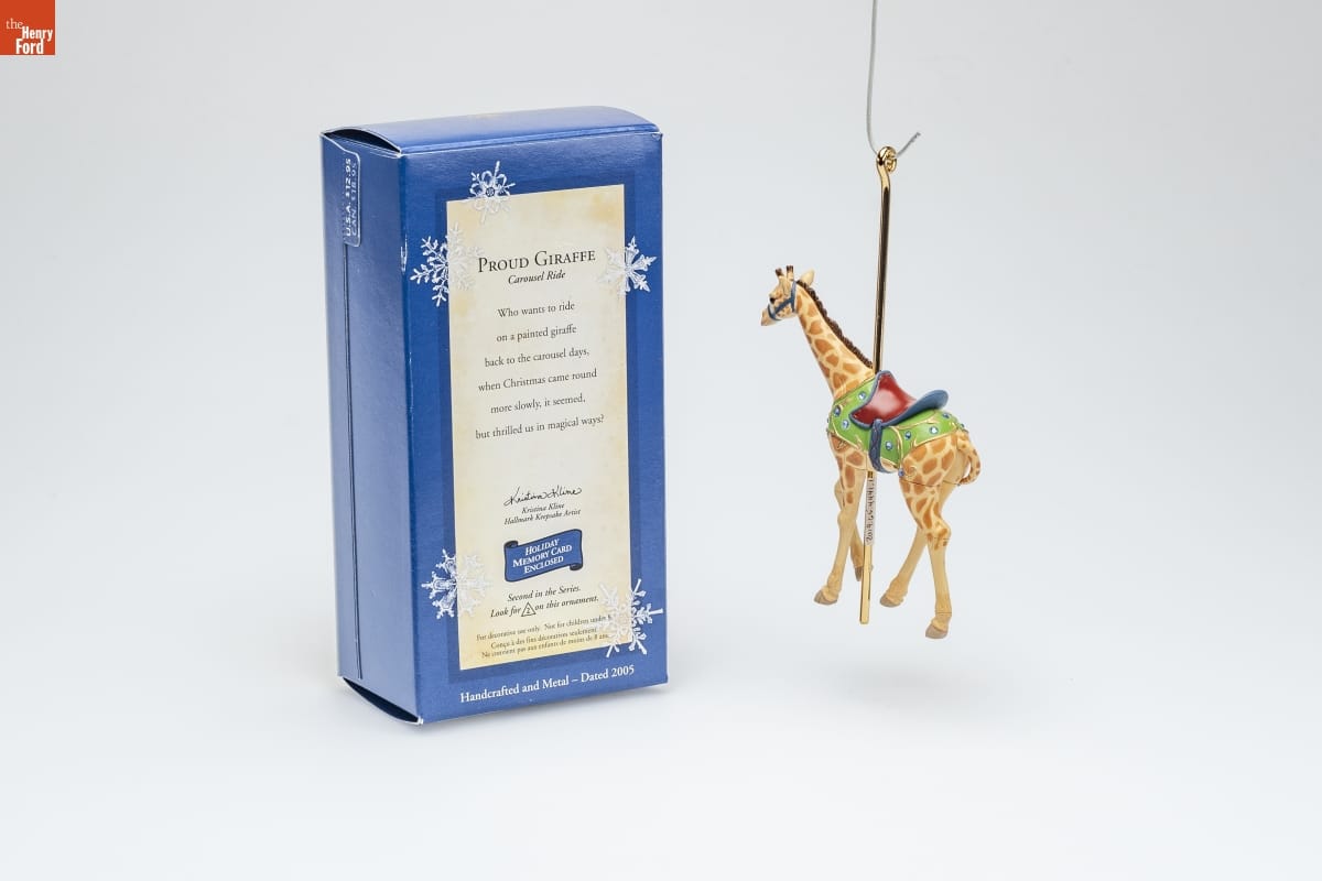 PROUD GIRAFFE / Carousel Ride / Who wants to ride / on a painted giraffe / back to the carousel days, / when Christmas came round / more slowly, it seemed, / but thrilled us in magical ways! / Kristina Kline / Hallmark Keepsake Artist / HOLIDAY / MEMORY CARD / ENCLOSED / Second in the Series. / Look for 2 on this ornament. / For decorative use only. Not for children under 8. / Concu a des fins decoratives seulement. / Ne convient pas aux enfants de moins de 8 ans. / Handcrafted and Metal - Dated 2005