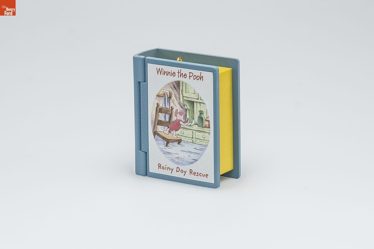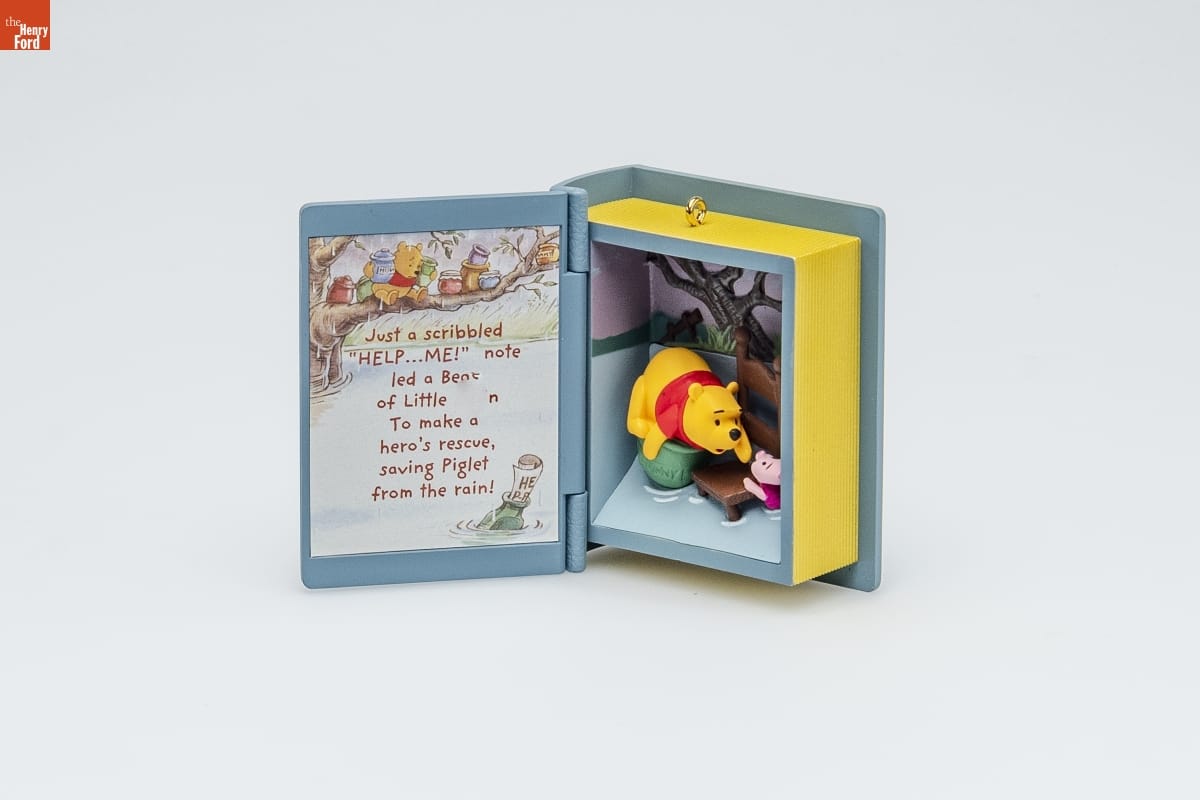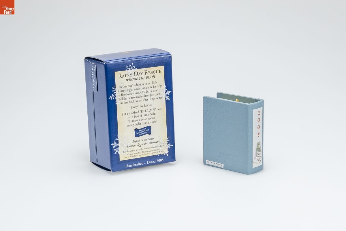 RAINY DAY RESCUE / WINNIE THE POOH / In this year's addition to our little / library, Piglet sends out a note for help / as floodwaters rise. Oh, dearie dear! / Will he be rescued in time? Just open / this tiny book to see what happens next: / Rainy Day Rescue / Just a scribbled "HELP...ME!" note / led a Bear of Little Brain / To make a hero's rescue, / saving Piglet from the rain! / HOLIDAY / MEMORY CARD / ENCLOSED / Eighth in the Series. / Look for 8 on this ornament. / For decorative use only. Not for children under 8. / Concu a des fins decoratives seulement. / Ne convient pas aux enfants de moins de 8 ans. / Handcrafted - Dated 2005