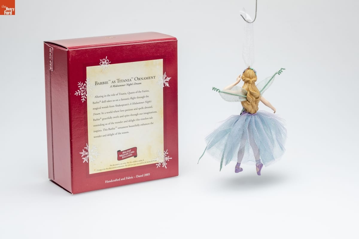 BARBIE [TM] A TITANIA [TM] ORNAMENT / A Midsummer Night's Dream / Alluring in the role of Titania, Queen of the Fairies, / Barbie [R] doll takes us on a fantastic flight through the / magical woods from Shakespeare's A Midsummer Night's / Dream. In a world where love potions and spells abound, / Barbie [R] gracefully twirls and spins through our imaginations, / reminding us of the wonder and delight this timeless tale / inspires. This Barbie [TM] ornament beautifully enhances the / wonder and delight of the season. / HOLIDAY / MEMORY CARD / ENCLOSED / For decorative use only. Not for children under 8. / Concu a des fins decoratives seulement. Ne convient pas aux enfants de moins de 8 ans. / Handcrafted and Fabric - Dated 2005