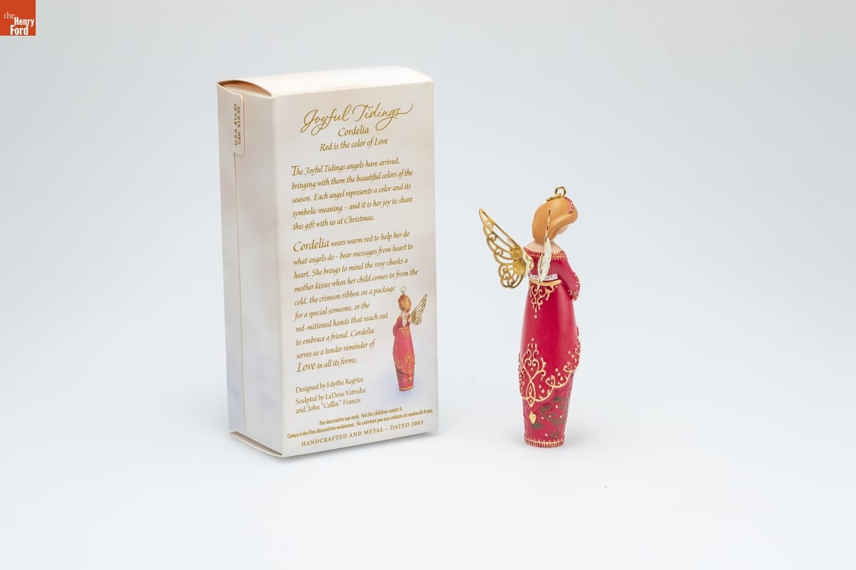 Joyful Tidings / Cordelia / Red is the color of Love / The Joyful Tidings angels have arrived, / bringing with them the beautiful colors of the / season. Each angel represents a color and its / symbolic meaning - and it is her joy to share / this gift with us at Christmas. / Cordelia wears warm red to help her do / what angels do - bear the messages from heart to / heart. She brings to mind the rosy cheeks a / mother kisses when her child comes in from the / cold, the crimson ribbon on a package / for a special someone, or the / red-mittened hands that reach out / to embrace a friend. Cordelia / serves as a tender reminder of / Love in all its forms. / Designed by Edythe Kegrize / Sculpted by LaDene Votruba / and John "Collin" Francis / For decorative use only. Not for children under 8. / Concu a des fins decoratives seulement. / Ne convient pas aux enfants de moins de 8 ans. / HANDCRAFTED AND METAL - DATED 2005
