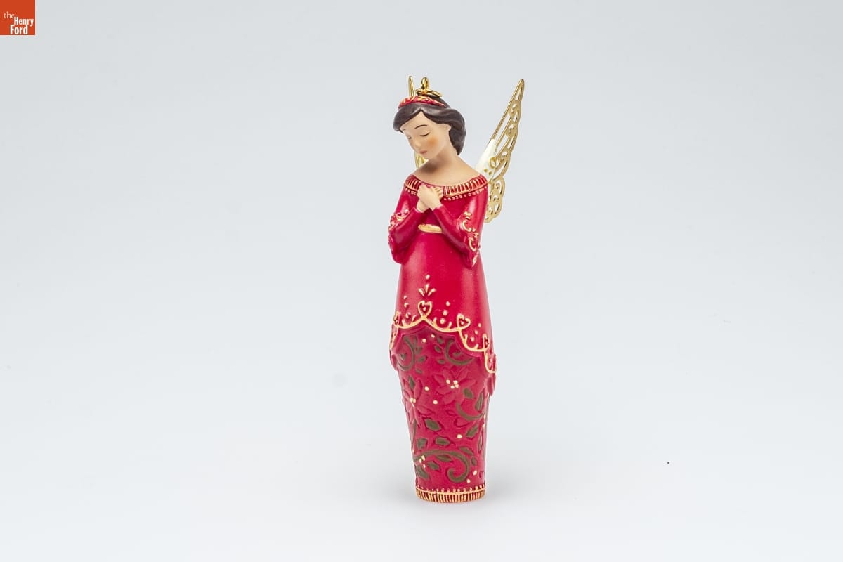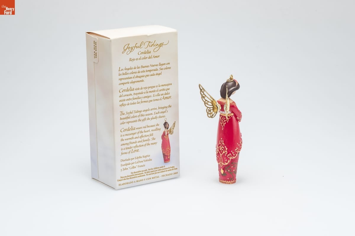 Joyful Tidings / Cordelia / Rojo es el color del Amor / Los Angeles de las Buenas Nuevas llegan con / los bellos colores de esta temporada. Sus colores / representan el obsequio que cada angel / comparte alegremente. / Cordelia viste de rojo porque es la mensajena / del corazon, trayendo a la mente el carino que / existe entre familia amigos. Es ella un dulce / reflejo de todas las formas que toma el Amor. / The Joyful Tidings angels arrive, bringing the / beautiful colors of this season. Each angel's / color represents the gift she gladly shares. / Cordelia wears red because she / is a messenger of the heart, recalling / the warmth and affection felt / among friends and family. She / is a tender reflection of the many / forms of Love. / Disenado por Edythe Kegrize / Esculpido por LaDene Votruba / y John "Collin" Francis / For decorative use only. Not for children under 8. / Para uso decorativo uticamente. No debe usarse por ninos menores de 8 anos. / Concu a des fins decoratives seulement. / Ne convient pas aux enfants de moins de 8 ans. / ELABORADO A MANO Y CON METAL - FECHADO 2005