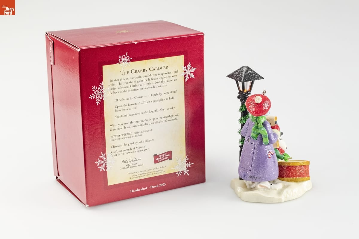 THE CRABBY CAROLER / It's that time of year again, and Maxine is up to her usual / antics. This year she rings in the holidays singing her own / version of several Christmas favorites. Push the button on / the back of the ornament to hear such classics as: / I'll be home for Christmas...Hopefuly, home alone! / Up on the housetop!...That's a good place to hide / from the relatives! / Should old acquaintance be forgot?...Yeah, usually. / When you push the button, the lamp in the streetlight will / illuminate. It will automatically turn off after 20 seconds. / BATTERY-OPERATED. Batteries included. / Instructions printed inside box. / Character designed by John Wagner / Can't get enough of Maxine? / Visit her at: www.hallmark.com / Mike Dirham / Hallmark Keepsake Artist / HOLIDAY / MEMORY CARD / ENCLOSED / For decorative use only. Not for children under 8. / Concu a des fins decoratives seulement. / Ne convient pas aux enfants de moins de 8 ans. / Handcrafted - Dated 2005