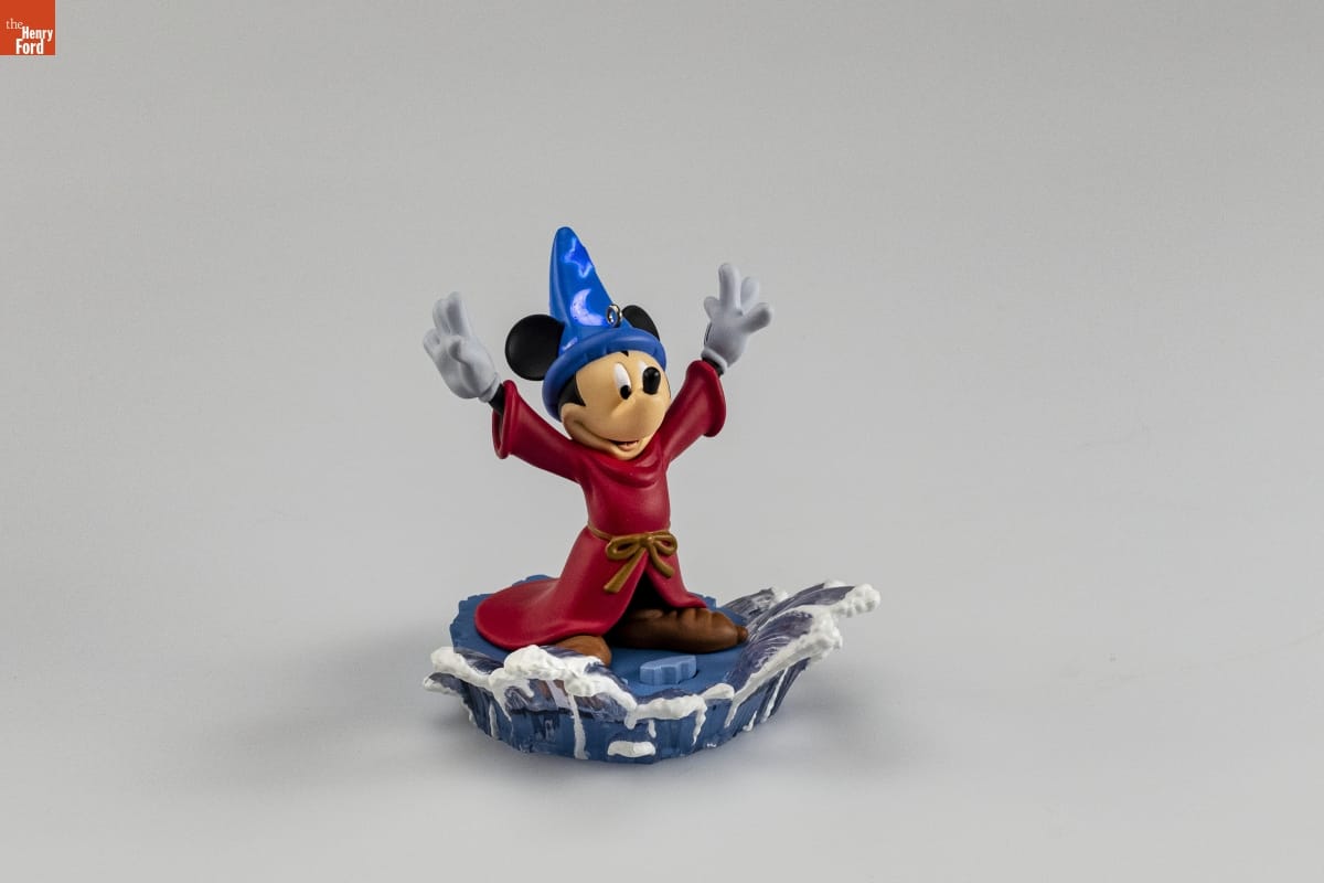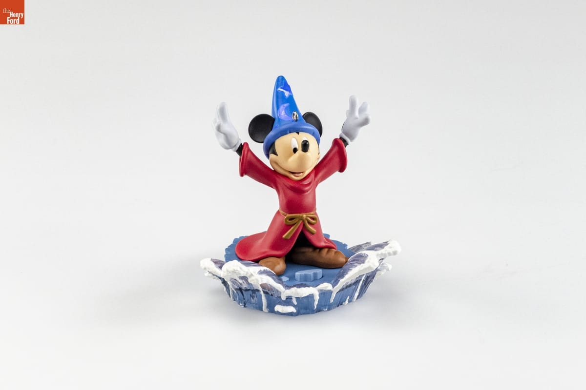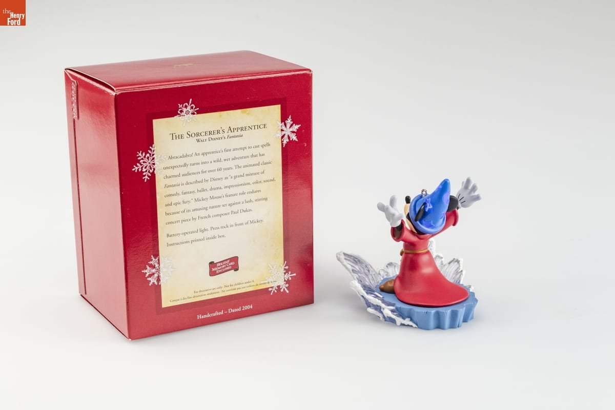 THE SORCERER'S APPRENTICE / WALT DISNEY'S Fantasia / Abracadabra! An apprentice's first attempt to cast spells / unexpectedly turns into a wild, wet adventure that has / charmed audiences for over 60 years. The animated classic / Fantasia is described by Disney as "a grand mixture of / comedy, fantasy, ballet, drama, impressionism, color, sound, / and epic fury." Mickey Mouse's feature role endures / because of its amusing nature set against a lush, stirring / concert piece by French composer Paul Dukas. / Battery-operated light. Press rock in front of Mickey. / Instructions printed inside box. / HOLIDAY / MEMORY CARD / ENCLOSED / For decorative use only. Not for children under 8. / Concue a des fins decoratives seulement. Ne convient pas aux enfants de moins de 8 ans. / Handcrafted - Dated 2004