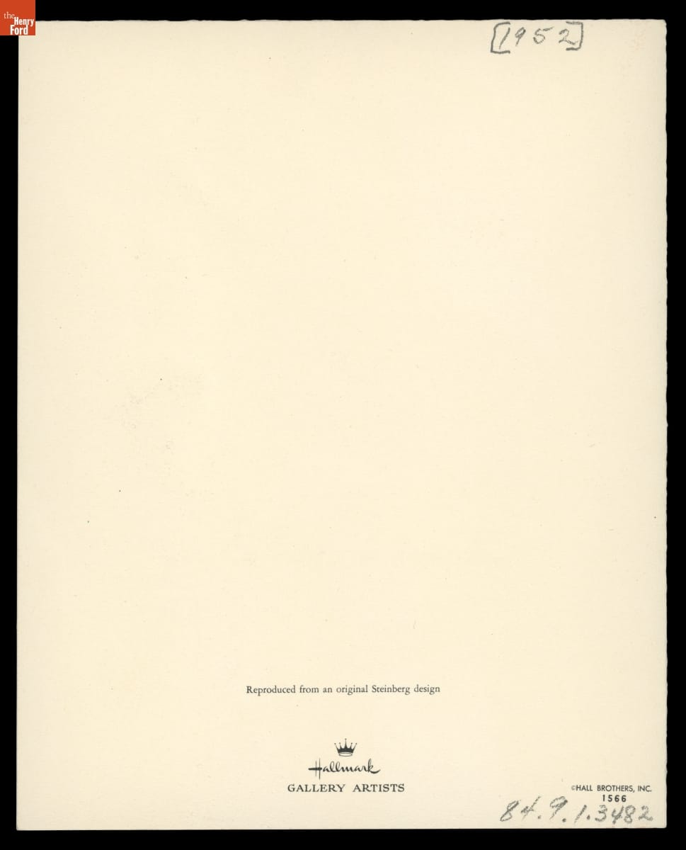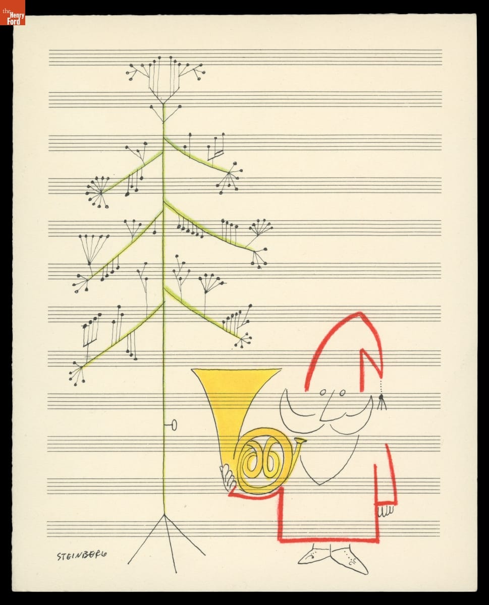 Saul Steinberg (1914-1999), a Romanian-born US immigrant, had a multifaceted artistic career, exhibiting his works in museums and galleries nationally and internationally. He is best remembered for his humorous, whimsical line drawings created for the New Yorker magazine over more than six decades beginning in the 1940s. Steinberg was equally adept at design, producing advertisements and designing textiles and Christmas cards.