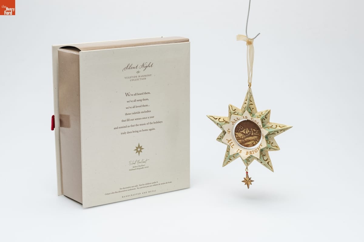 Silent Night / Yuletide Harmony / We've all heard them, / we've all sung them, / we've all loved them... / those yuletide melodies / that fill our senses once a year / and remind us that the music of the holidays / truly does bring us home again. / Robert Hurlburt / Hallmark Keepsake Artist / For decorative use only. Not for children under 8. / Concu a des fins decoratives seulement. Ne convient pas aux enfants de moins de 8 ans. / HANDCRAFTED AND METAL