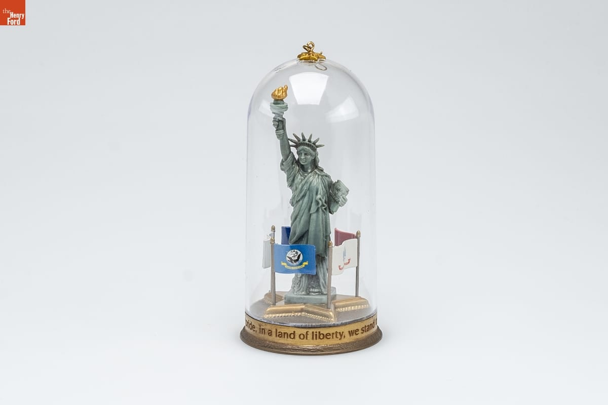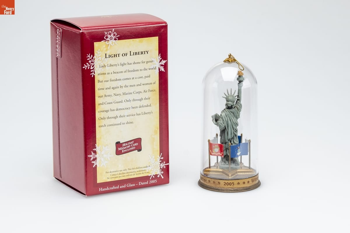 Lady Liberty's light has shone for gener- / ations as a beacon of freedom to the world. / But our freedom comes at a cost, paid / time and again by the men and women of / our Army, Navy, Marine Corps, Air Force, / and Coast Guard. Only through their / courage has democracy been defended. / Only through their service has Liberty's / torch continued to shine. / HOLIDAY / MEMORY CARD / ENCLOSED / For decorative use only. Not for children under 8. / Concu a des fins decoratives seulement. / Ne convient pas aux enfants de moins de 8 ans. / Handcrafted and Glass - Dated 2005