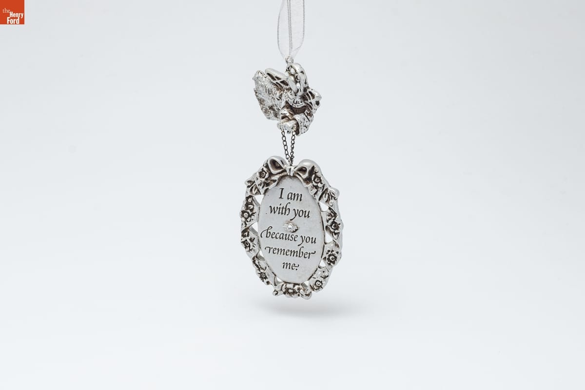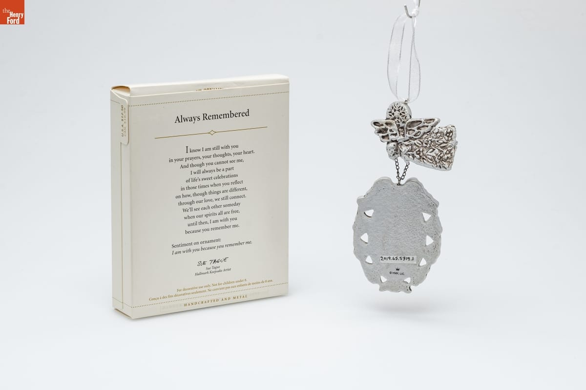 Always Remembered / I know I am still with you / in your prayers, your thoughts, your heart. / And though you cannot see me, / I will always be a part / of life's sweet celebrations / in those times when you reflect / on how, though things are different, / through our love, we still connect. / We'll see each other someday / when our spirits are all free, / until then, I am with you / because you remember me. / Sentiment on ornament: / I am with you because you remember me. / Sue Tague / Hallmark Keepsake Artist / For decorative use only. Not for children under 8. / Concu a des fins decoratives seulement. Ne convient pas aux enfants de moins de 8 ans. / HANDCRAFTED AND METAL