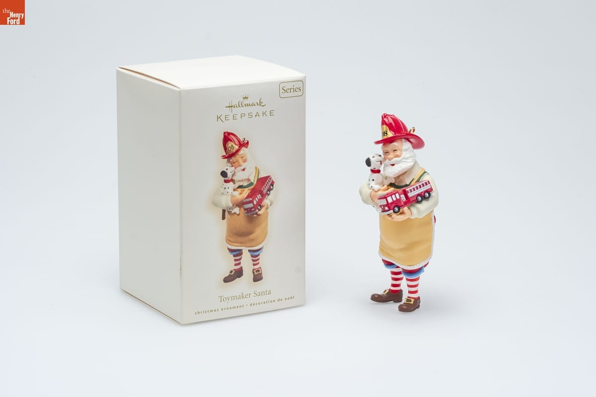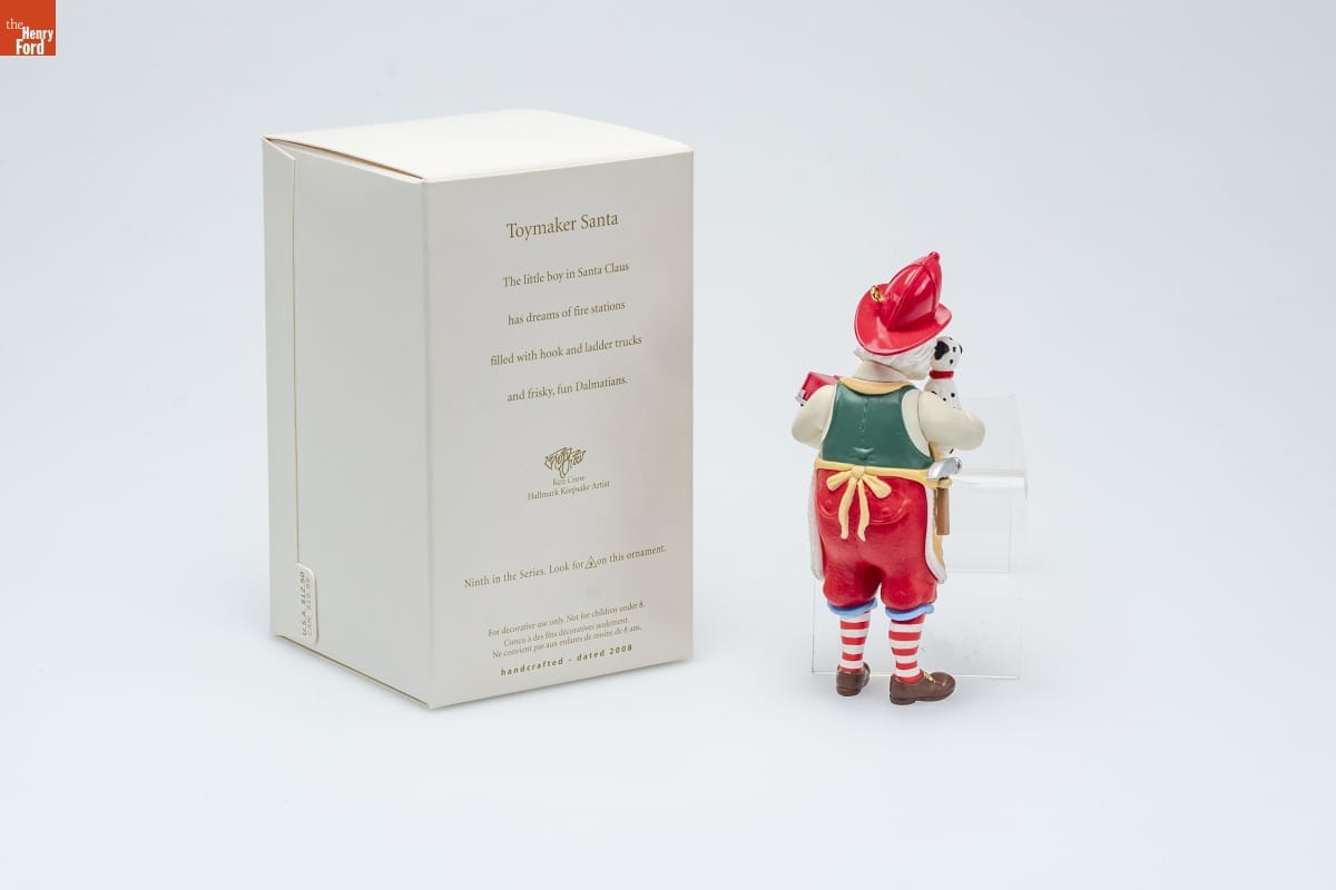 Toymaker Santa / The little boy in Santa Claus / has dreams of fire stations / filled with hook and ladder trucks / and frisky, fun Dalmatians. / Ken Crow / Hallmark Keepsake Artist / Ninth in the Series. Look for 9 on this ornament. / For decorative use only. Not for children under 8. / Concu a des fins decoratives seulement. / Ne convient pas aux enfants de moins de 8 ans. / handcrafted - dated 2008