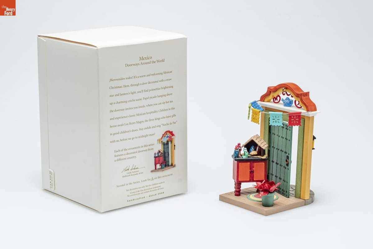 Mexico / Doorways Around the World / Bienvenidos todos! It's a warm and welcoming Mexican / Christmas. Here, through a door decorated with a straw / star and lantern's light, you'll find poinsettias brightening / up a charming creche scene. Papel picado hanging above / the doorway invites you inside, where you can sip hot tea / and experience classic Mexican hospitality. Children in this / home await Los Reyes Magos, the three kings who leave gifts / in good children's shoes. Stay awhile and sing "Noche de Paz" / with us, before we go to midnight mass! / Each of the ornaments in this series / features a decorated doorway from / a different country. / Linda Sickman / Hallmark Keepsake Artist / Second in the Series. Look for 2 on this ornament. / For decorative use only. Not for children under 8. / Concu a des fins decoratives seulement. / Ne convient pas aux enfants de moins de 8 ans. / handcrafted - dated 2008