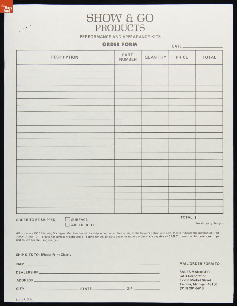 CAR Corporation Sales Literature and Order Form, circa 1972