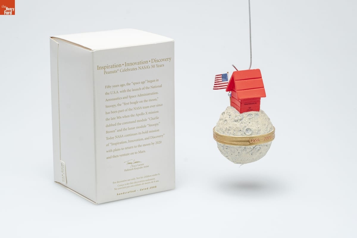 Inspiration Innovation Discovery / Peanuts(R) Celebrates NASA's 50 Years / Fifty years ago, the "space age" began in / the U.S.A. with the launch of the National / Aeronautics and Space Administration. / Snoopy, the "first beagle on the moon," / has been part of the NASA team ever since / the late '60s when the Apollo X mission / dubbed the command module "Charlie / Brown" and the lunar module "Snoopy." / Today NASA continues its bold mission / of "Inspiration, Innovation, and Discovery" / with plans to return to the moon by 2020 / and then venture on to Mars. / Tracy Larsen / Hallmark Keepsake Artist / For decorative use only. Not for children under 8. / Concu a des fin decoratives seulement. / Ne convient pas aux enfants de moins de 8 ans. / handcrafted - dated 2008