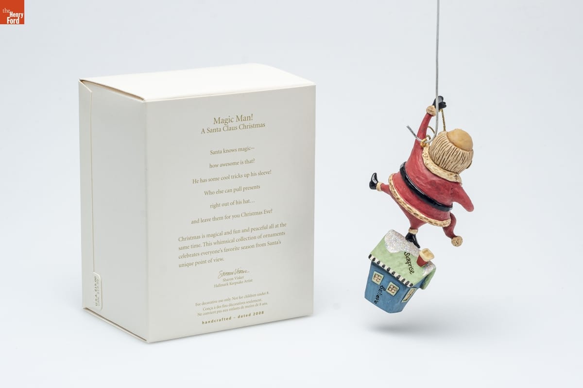 Magic Man! / A Santa Claus Christmas / Santa knows magic-- / how awesome is that? / He has some cool tricks up his sleeve! / Who else can pull presents / right out of his hat... / and leave them for you Christmas Eve? / Christmas is magical and fun and peaceful all at the / same time. This whimsical collection of ornaments / celebrates everyone's favorite season from Santa's / unique point of view. / Sharon Visker / Hallmark Keepsake Artist / For decorative use only. Not for children under 8. / Concu a des fins decoratives seulement. / Ne convient pas aux enfants de moins de 8 ans. / handcrafted - dated 2008