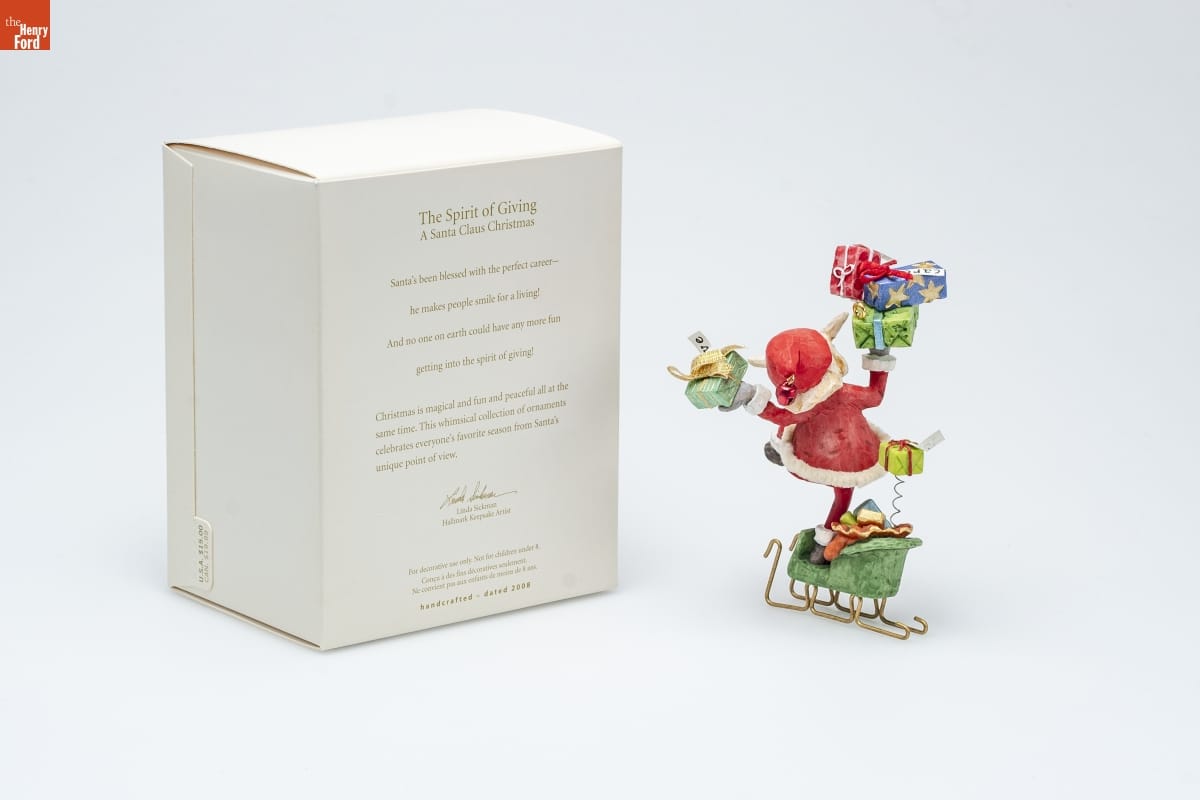 The Spirit of Giving / A Santa Claus Christmas / Santa's been blessed with the perfect career-- / he makes people smile for a living! / And no one on earth could have any more fun / getting into the spirit of giving! / Christmas is magical and fun and peaceful all at the / same time. This whimsical collection of ornaments / celebrates everyone's favorite season from Santa's / unique point of view. / Linda Sickman / Hallmark Keepsake Artist / For decorative use only. Not for children under 8. / Concu a des fins decoratives seulement. / Ne convient pas aux enfants de moins de 8 ans. / handcrafted - dated 2008