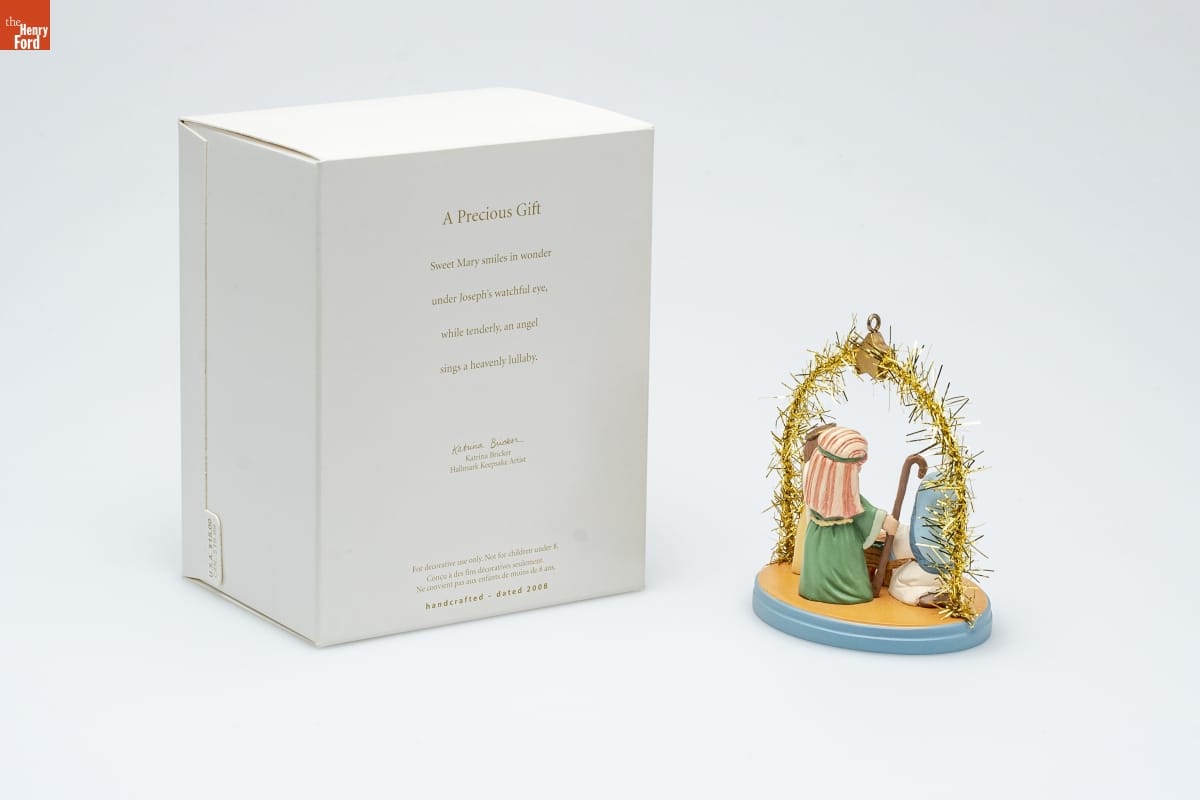 A Precious Gift / Sweet Mary smiles in wonder / under Joseph's watchful eye, / while tenderly, an angel / sings a heavenly lullaby. / Katrina Bricker / Hallmark Keepsake Artist / For decorative use only. Not for children under 8. / Concu a des fins decoratives seulement. / Ne convient pas aux enfants de moins de 8 ans. / handcrafted - dated 2008