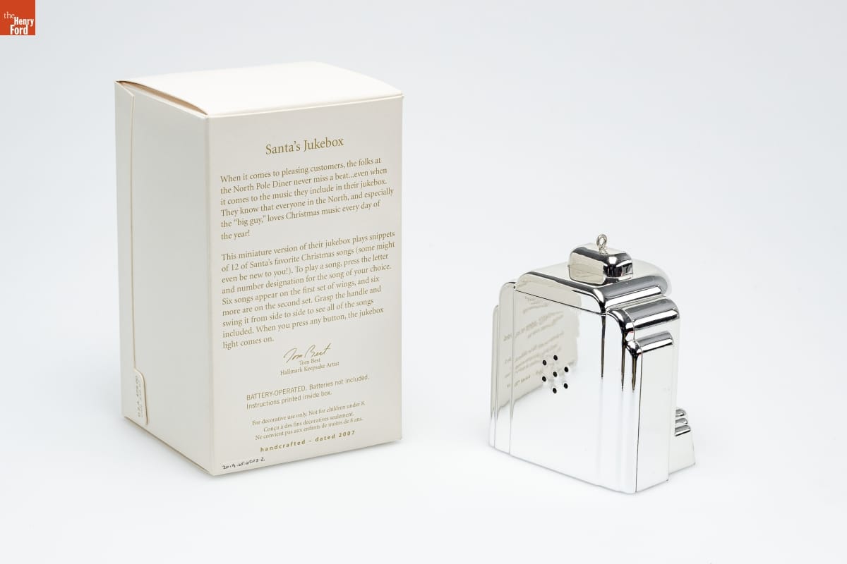 Santa's Jukebox / When it comes to pleasing customers, the folks at / the North Pole Diner never miss a beat...even when / it comes to the music they include in their jukebox. / They know that everyone in the North, and especially / the "big guy," loves Christmas music every day of / the year! / This miniature version of their jukebox plays snippets / of 12 of Santa's favorite Christmas songs (some might / even be new to you!) To play a song, press the letter / and number designation for the song of your choice. / Six songs will appear on the first set of wings, and six / more are on the second set. Grasp the handle and / swing it from side to side to see all of the songs / included. When you press any button, the jukebox / light comes on. / Tom Best / Hallmark Keepsake Artist / BATTERY-OPERATED. Batteries not included. / Instructions printed inside box. / For decorative use only. Not for children under 8. / Concu a des fins decoratives seulement. / Ne convient pas aux enfants de moins de 8 ans. / handcrafted - dated 2007