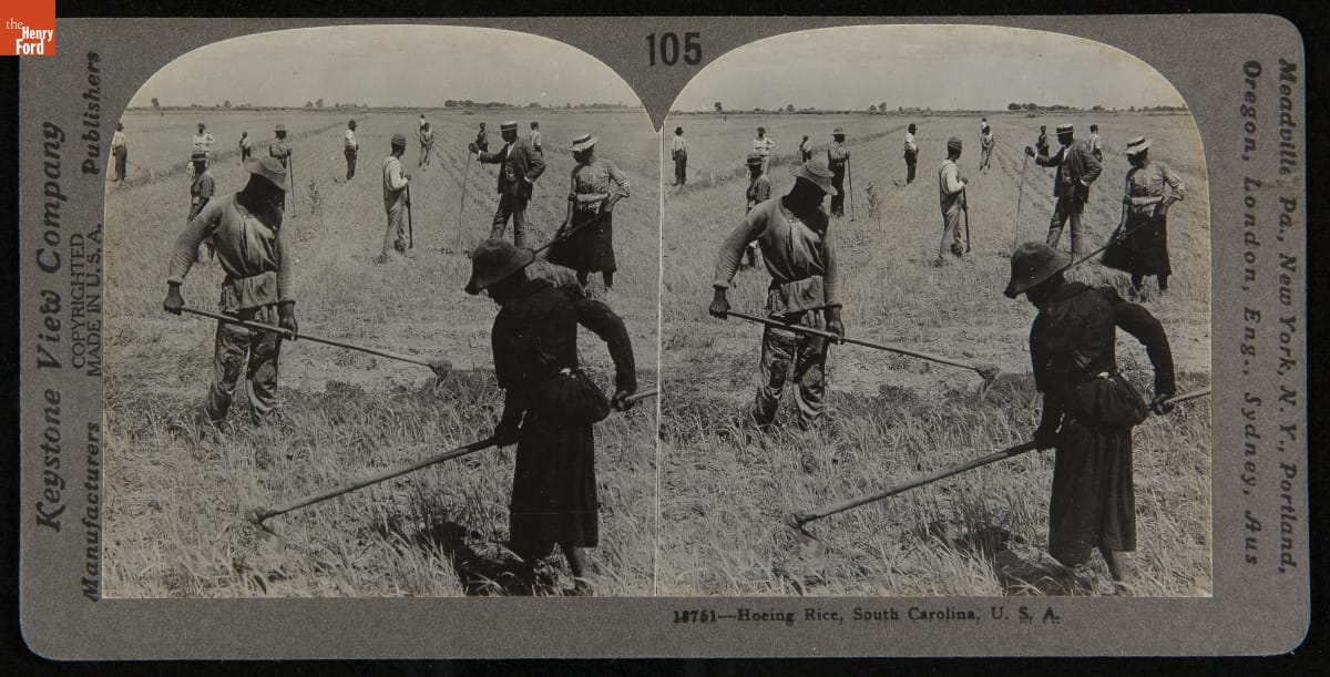 Rice grows best when fields are flooded at planting time and periodically during the growing season. Managing the water levels required an infrastructure as well as regular maintenance. This stereograph shows workers with a broad and heavy hoe, removing weeds and deepening the channel in a rice field.