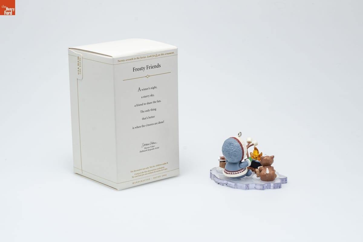 Twenty-seventh in the Series. Look for 27 on this ornament. / Frosty Friends / A winter's night, / a starry sky, / a friend to share the fun. / The only thing / that's better / is when the s'mores are done! / Sharon Visker / Hallmark Keepsake Artist / For decorative use only. Not for children under 8. / Concu a des fins decoratives seulement. Ne convient pas aux enfants de moins de 8 ans. / HANDCRAFTED - DATED 2006