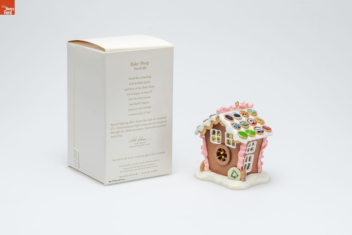 Bake Shop / Noelville / Noelville is bustling / with holiday spirit, / and here at the Bake Shop, / we're happy to hear it! / Our favorite season / has finally begun-- / come in and indulge / a sweet taste of fun! / Special lighting effect: Insert the bulb of a standard / U.L.-listed miniature light string into the ornament / through the rubber grommet. Instructions printed / inside box. / Linda Sickman / Hallmark Keepsake Artist / Second in the Series. Look for 2 on this ornament. / For decorative use only. Not for children under 8. / Concu a des fins decoratives seulement. / Ne convient pas aux enfants de moins de 8 ans. / handcrafted - dated 2007