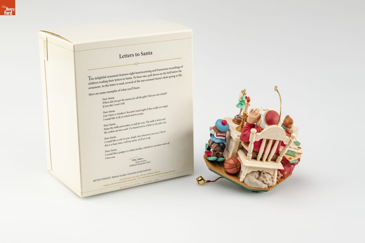 Letters to Santa / This delightful ornament features eight heartwarming and humorous recordings of / children reading their letters to Santa. To hear one, pull down on the bell below the / ornament. As the letter is read, several of the toys around Santa's desk spring to life. / Here are some examples of what you'll hear: / Dear Santa, / Where did you get the money for all the gifts? Did you rob a bank? / If you did, I won't tell. / Dear Santa, / Can I have a reindeer? You don't need eight if they really are magic. / I would like to fly to school and to scouts. / Dear Santa, / Enjoy the milk and cookies we left for you. The milk is skim and / the cookies are low-carb. I've heard you're a little on the plus size. / Dear Santa, / I would like a ride in your sleigh. Just whenever you can, I know / this is a busy time. Call my mom, we'll set it up. / Dear Santa, / I would like a puppy or a baby brother, whichever you have more of. / I love you. / Tracy Larsen / Hallmark Keepsake Artist / BATTERY-OPERATED. Batteries included. Instructions printed inside box. / For decorative use only. Not for children under 8. / Concu a des fins decoratives seulement. Ne convient pas aux enfants de moins de 8 ans. / HANDCRAFTED - DATED 2006