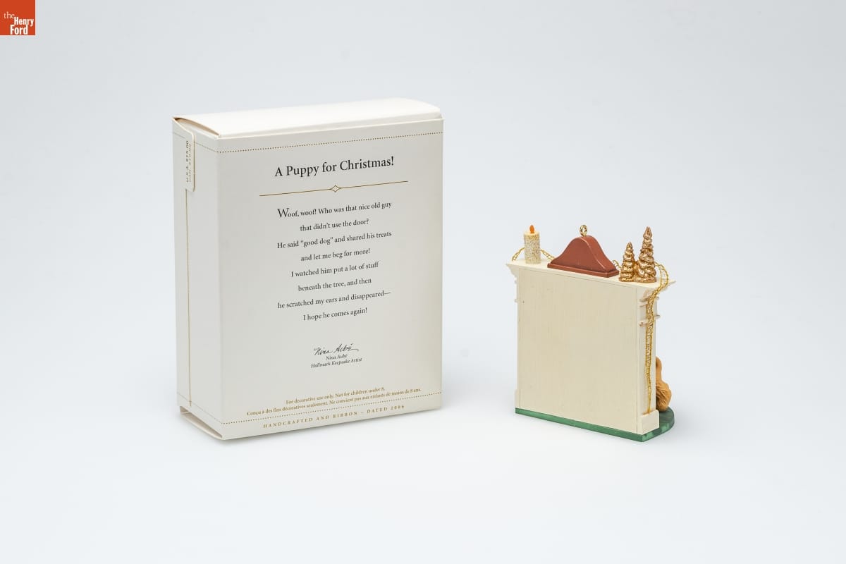 A Puppy for Christmas! / Woof, woof! Who was that nice old guy / that didn't use the door? / He said "good dog" and shared his treats / and let me beg for more! / I watched him put a lot of stuff / beneath the tree, and then / he scratched my ear and disappeared-- / I hope he comes again! / Nina Aube / Hallmark Keepsake Artist / For decorative use only. Not for children under 8. / Concu a des fins decoratives seulement. Ne convient pas aux enfants de moins de 8 ans. / HANDCRAFTED AND RIBBON - DATED 2006