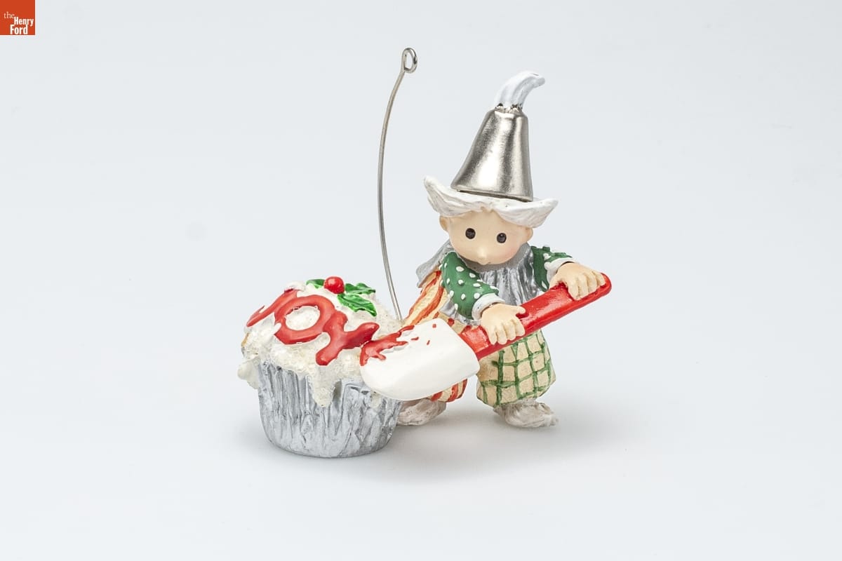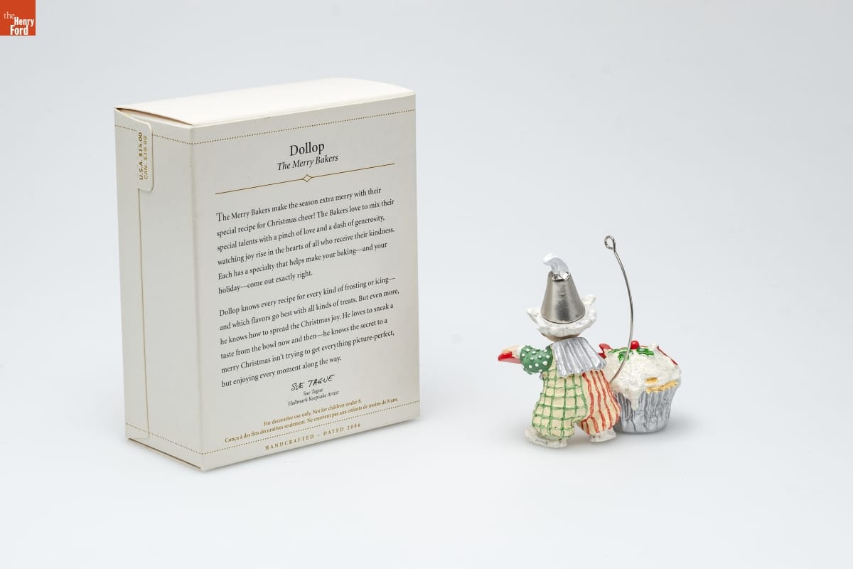 Dollop / The Merry Bakers / The Merry Bakers make the season extra special with their special / recipe for Christmas cheer! The Bakers love to mix their special / talents with a pinch of love and a dash of generosity, watching joy / rise in the hearts of all who receive their kindness. Each has a / specialty that helps make your baking--and your holiday--come / out exactly right. / Dollop knows every recipe for every kind of frosting or icing-- / and which flavors go best with all kinds of treats. But even more, / he knows how to spread the Christmas joy. He loves to sneak a / taste from the bowl now and then--he knows the secret to a / merry Christmas isn't trying to get everything picture-perfect, / but enjoying every moment along the way. / Sue Tague / Hallmark Keepsake Artist / For decorative use only. Not for children under 8. / Concu a des fins decoratives seulement. Ne convient pas aux enfants de moins de 8 ans. / HANDCRAFTED - DATED 2006