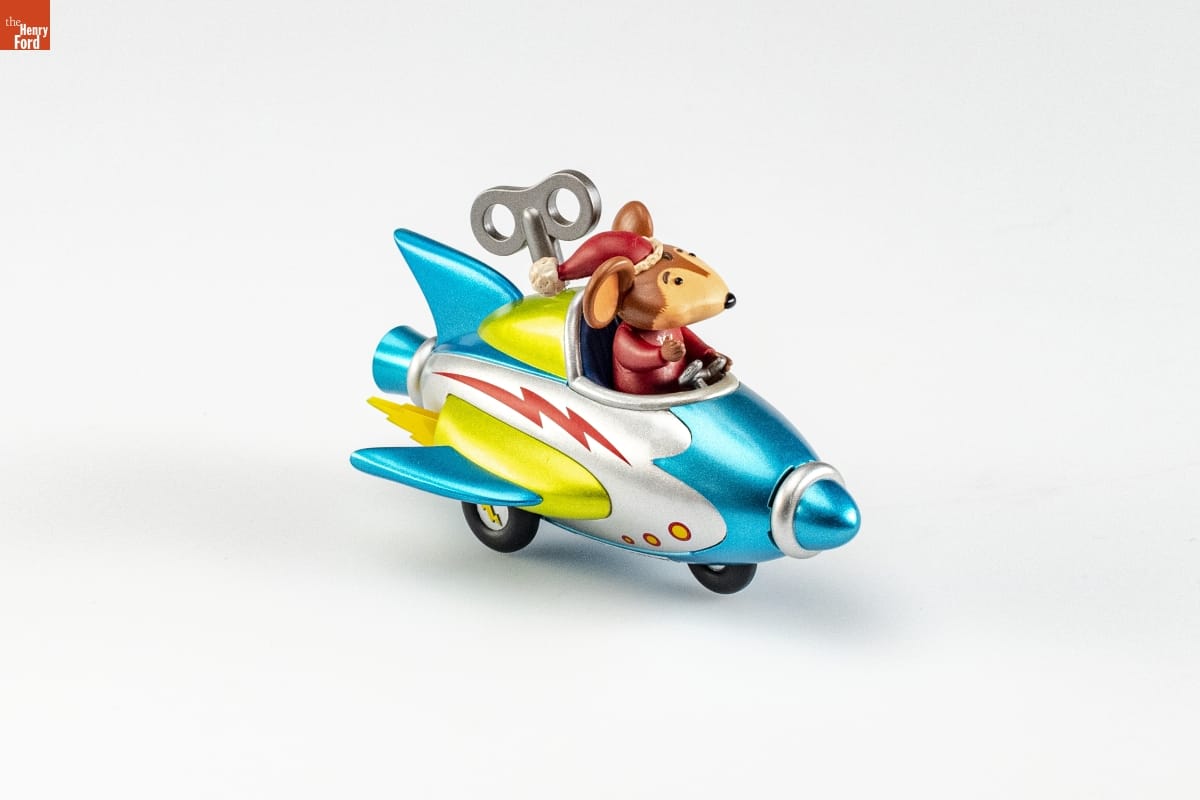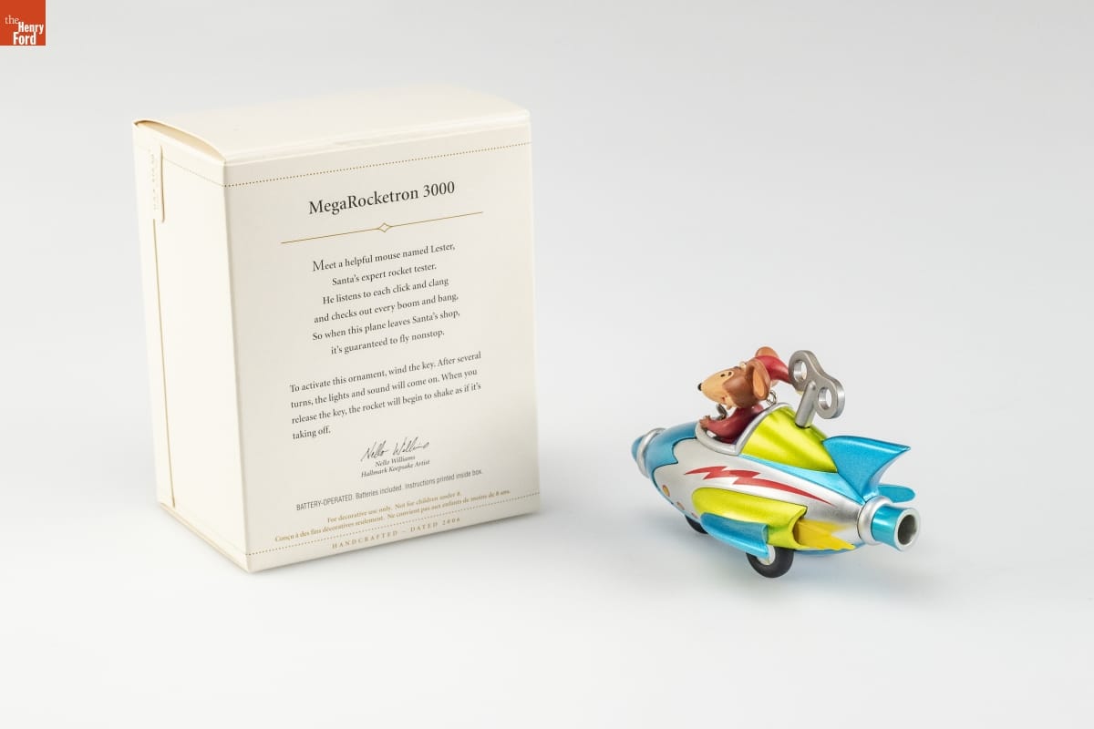 MegaRocketron 3000 / Meet a helpful mouse named Lester, / Santa's expert rocket tester. / He listens to each click and clang / and checks out every boom and bang, / So when this plane leaves Santa's shop, / it's guaranteed to fly nonstop. / To activate this ornament, wind the key. After several / turns, the lights and sound will come one. When you / release the key, the rocket will begin to shake as if it's / taking off. / Nello Williams / Hallmark Keepsake Artist / BATTERY-OPERATED. Batteries included. Instructions printed inside box. / For decorative use only. Not for children under 8. / Concu a des fins decoratives seulement. Ne convient pas aux enfants de moins de 8 ans. / HANDCRAFTED - DATED 2006