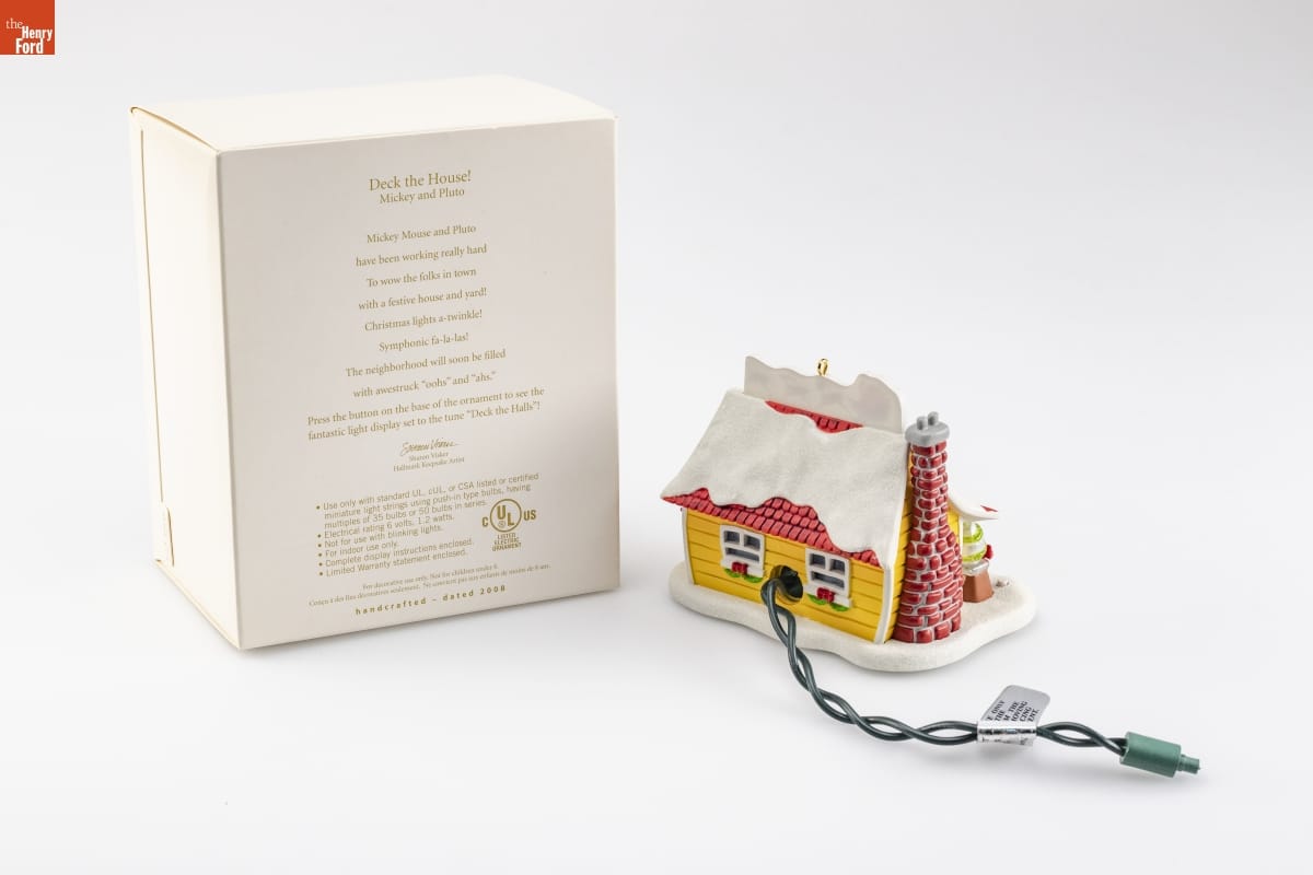 Deck the House! / Mickey and Pluto / Mickey Mouse and Pluto / have been working really hard / To wow the folks in town / with a festive house and yard! / Christmas lights a-twinkle! / Symphonic fa-la-las! / The neighborhood will soon be filled / with awestruck "oohs" and "ahs." / Press the button on the base of the ornament to see the / fantastic light display set to the tune "Deck the Halls"! / Sharon Visker / Hallmark Keepsake Artist / Use only with standard UL, cUL, or CSA listed or certified / miniature light strings using push-in type bulbs, having / multiples of 35 bulbs or 50 bulbs in series. / Electrical rating 6 volts, 1.2 watts. / Not for use with blinking lights. / For indoor use only. / Complete display instructions enclosed. / Limited Warranty statement enclosed. / C UL(R) US / LISTED / ELECTRIC / ORNAMENT / For decorative use only. Not for children under 8. / Concu a des fin decoratives seulement. Ne convient pas aux enfants de moins de 8 ans. / handcrafted - dated 2008
