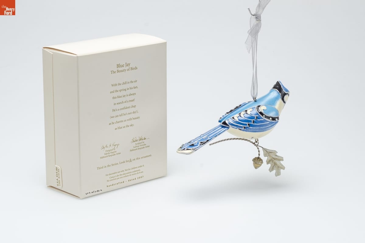 Blue Jay / The Beauty of Birds / With the chill in the air / and the spring in his feet, / this blue jay is always / in search of a treat! / He's a confident chap / (we can tell he's not shy!), / as he charms us with beauty / as blue as the sky. / Designed by / Edythe Kegrize / Hallmark Keepsake Artist / Sculpted by / LaDene Votruba / Hallmark Keepsake Artist / Third in the Series. Look for 3 on this ornament. / For decorative use only. Not for children under 8. / Concu a des fins decoratives seulement. / Ne convient pas aux enfants de moins de 8 ans. / handcrafted - dated 2007