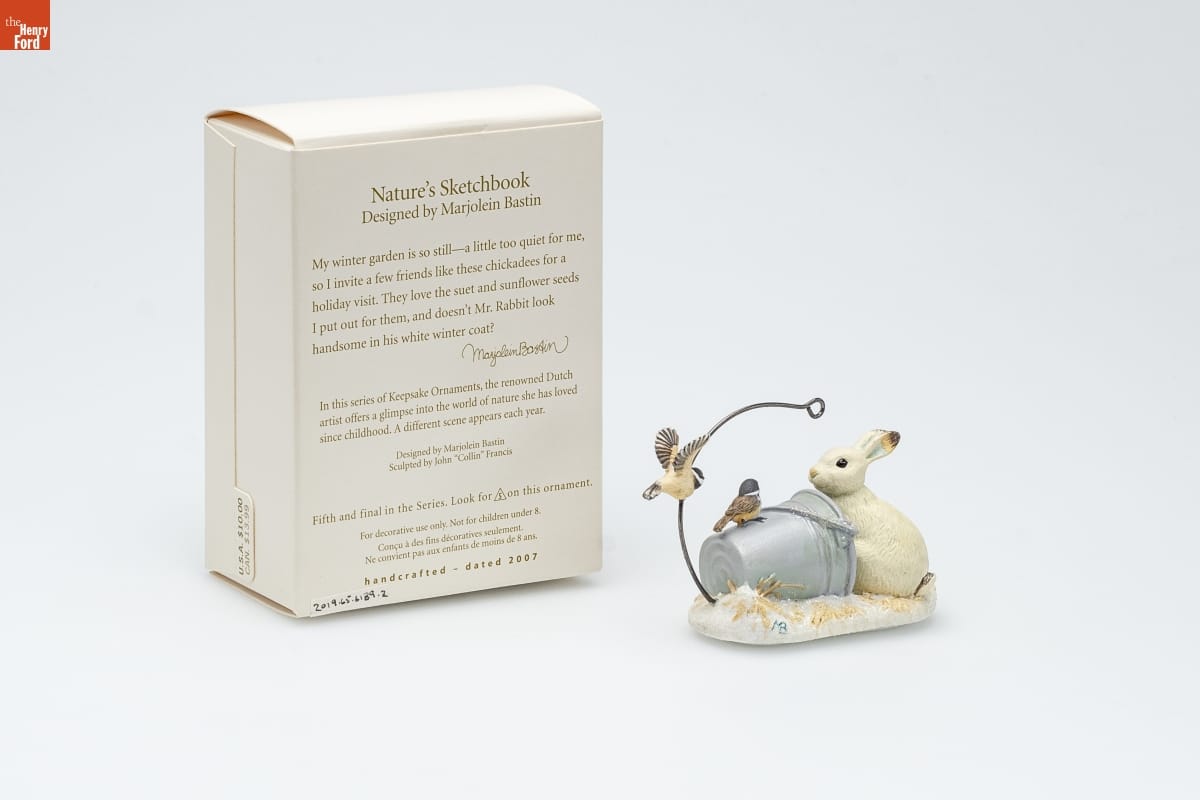 Nature's Sketchbook / Designed by Marjolein Bastin / My winter garden is so still--a little too quiet for me, / so I invite a few friends like these chickadees for a / holiday visit. They love the suet and sunflower seeds / I put out for them, and doesn't Mr. Rabbit look / handsome in his white winter coat? / Marjolein Bastin / In this series of Keepsake Ornaments, the renowned Dutch / artist offers a glimpse into the world of nature she has loved / since childhood. A different scene appears each year. / Designed by Marjolein Bastin / Sculpted by John "Collin" Francis / Fifth and final in the Series. Look for 5 on this ornament. / For decorative use only. Not for children under 8. / Concu a des fins decoratives seulement. / Ne convient pas aux enfants de moins de 8 ans. / handcrafted - dated 2007