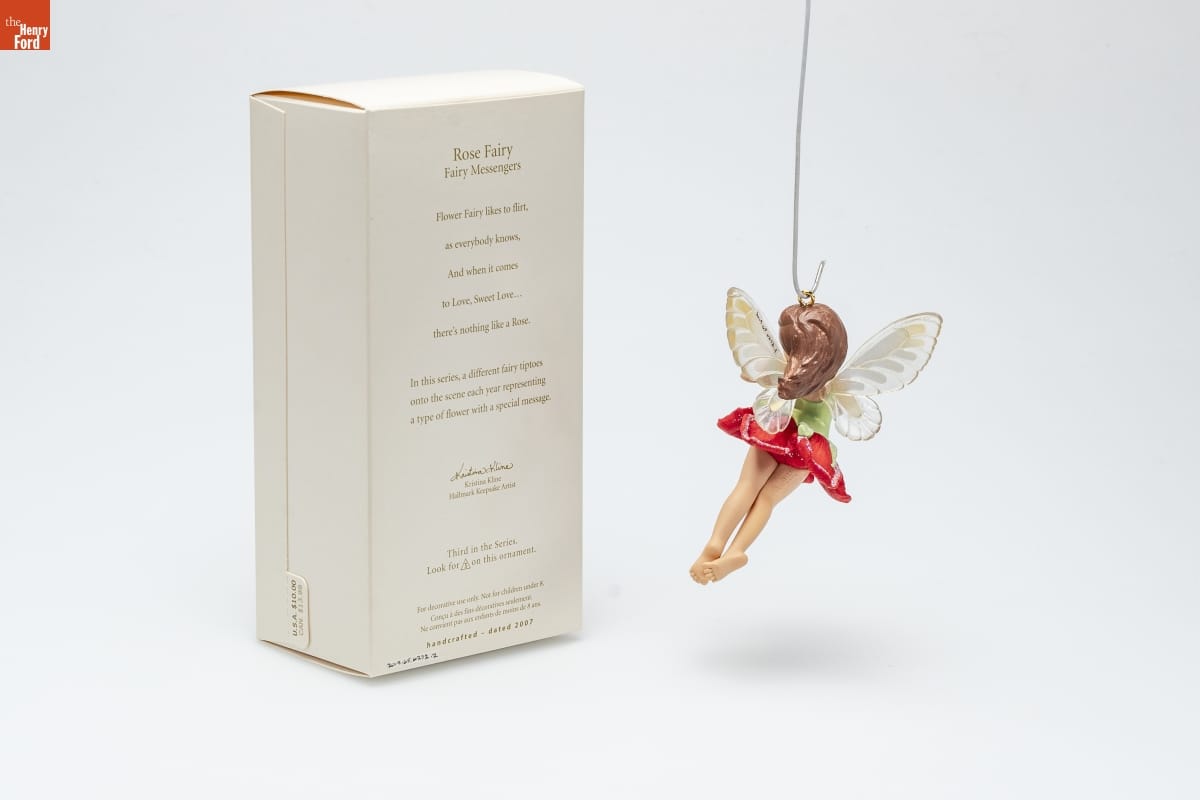 Rose Fairy / Fairy Messengers / Flower Fairy likes to flirt, / as everybody knows, / And when it comes / to Love, Sweet Love... / there's nothing like a Rose. / In this series, a different fairy tiptoes / onto the scene each year representing / a type of flower with a special message. / Kristina Kline / Hallmark Keepsake Artist / Third in the Series. / Look for 3 on this ornament. / For decorative use only. Not for children under 8. / Concu a des fins decoratives seulement. / Ne convient pas aux enfants de moins de 8 ans. / handcrafted - dated 2007