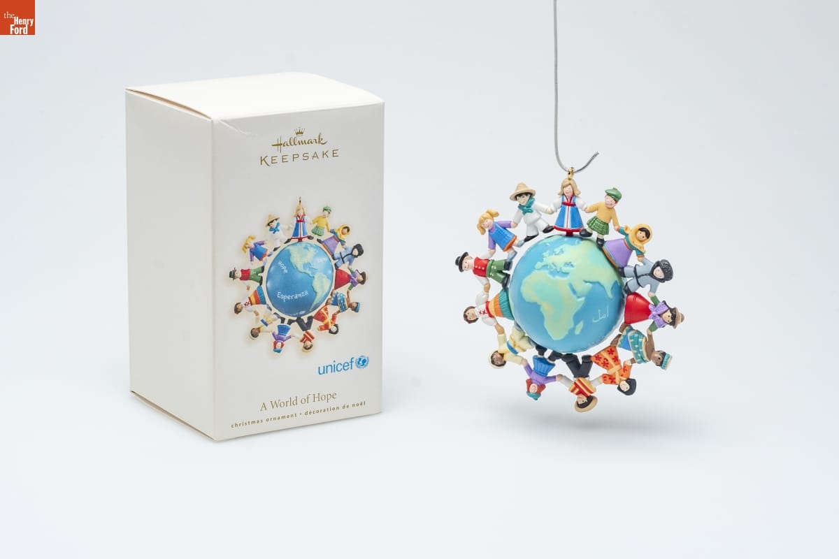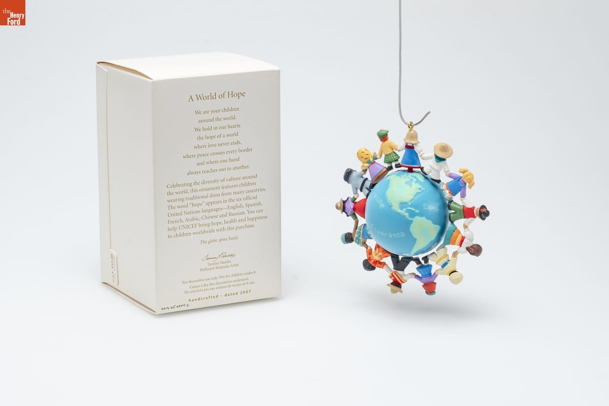 A World of Hope / We are your children / around the world. / We hold in our hearts / the hope of the world / where love never ends, / where peace crosses every border / and where one hand / always reaches out to another. / Celebrating the diversity of culture around / the world, this ornament features children / wearing traditional dress from many countries. / The word "hope" appears in the six official United Nations languages-- English, Spanish, / French, Arabic, Chinese and Russian. You can / help UNICEF bring hope, health and happiness / to children worldwide with this purchase. / The globe spins freely. / Tammy Haddix / Hallmark Keepsake Artist / For decorative use only. Not for children under 8. / Concu a des fins decoratives seulement. / Ne convient pas aux enfants de moins de 8 ans. / handcrafted - dated 2007