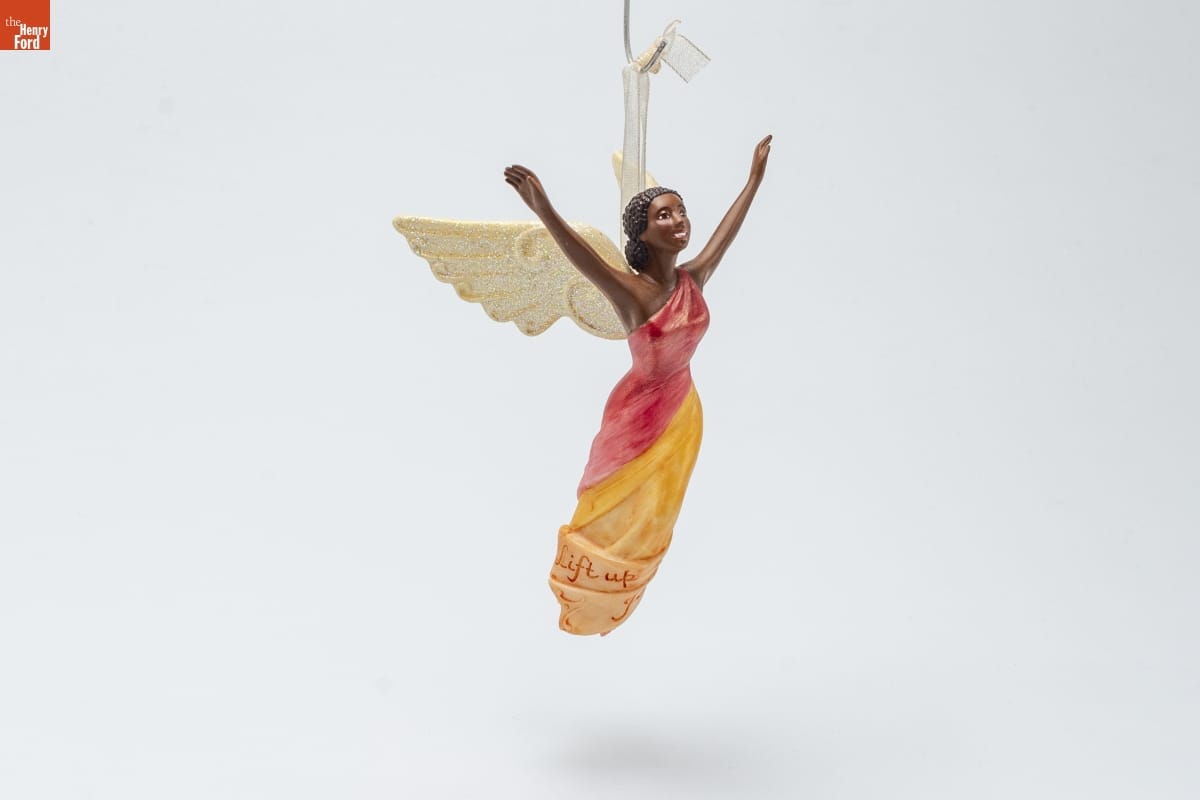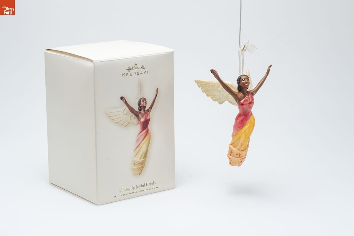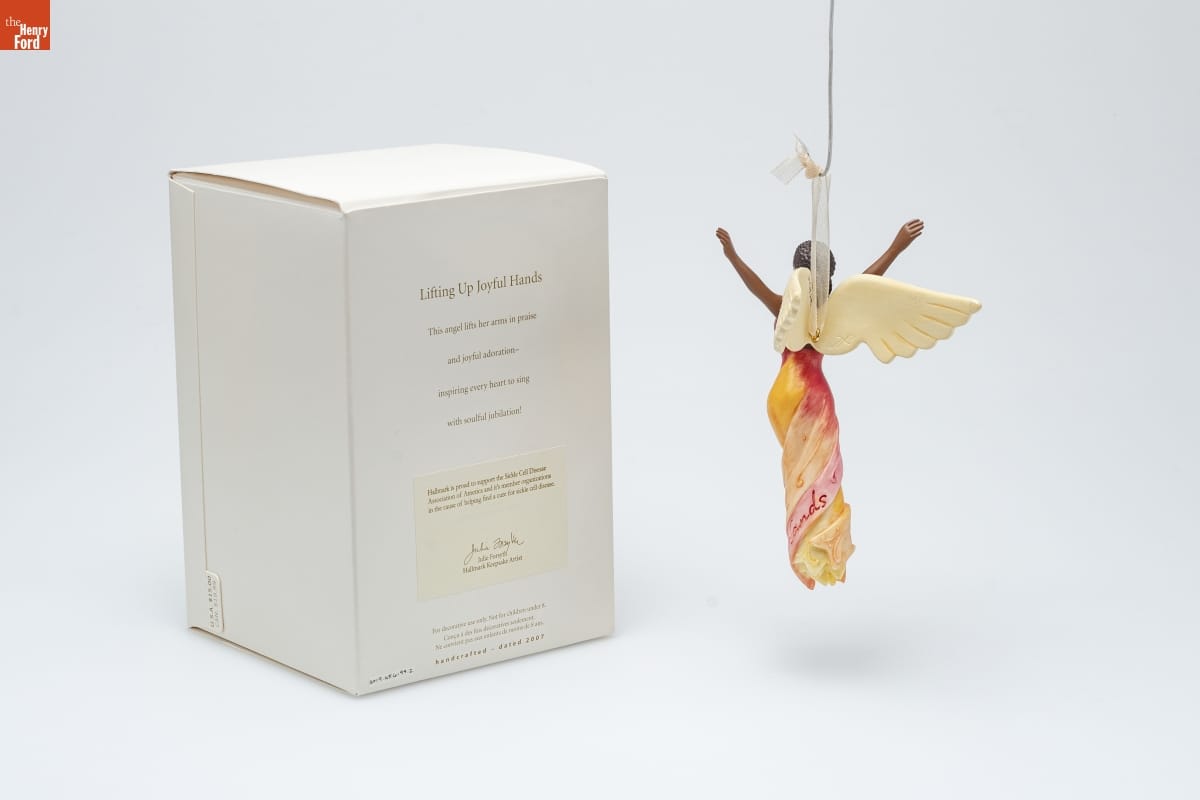 Lifting Up Joyful Hands / This angel lifts her arms in praise / and joyful adoration-- / inspiring every heart to sing, / with soulful jubilation! / Hallmark is proud to support the Sickle Cell Disease / Association of America and it's member organizations / in the cause of helping find a cure for sickle cell disease. / Julie Forsyth / Hallmark Keepsake Artist / For decorative use only. Not for children under 8. / Concu a des fins decoratives seulement. / Ne convient pas aux enfants de moins de 8 ans. / handcrafted - dated 2007