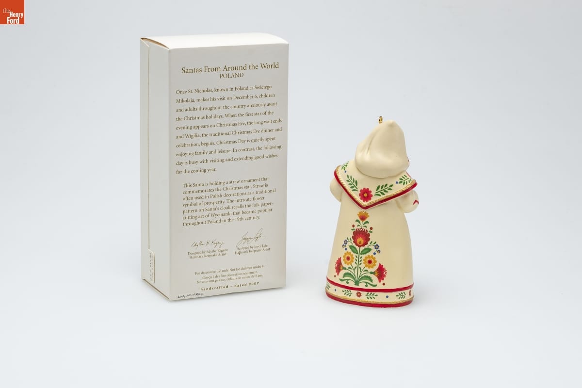 Santas From Around the World / POLAND / Once St. Nicholas, known in Poland as Sweitego / Mikolaja, makes his visit on December 6, children / and adults throughout the country anxiously await / the Christmas holidays. When the first star of the / evening appears on Christmas Eve, the long wait ends / and Wigilia, the traditional Christmas Day is quietly spent / enjoying family and leisure. In contrast, the following / day is busy with visiting and extending good wishes / for the coming year. / This Santa is holding a straw ornament that / commemorates the Christmas star. Straw is / often used in Polish decorations as a traditional / symbol of prosperity. The intricate flower / pattern on Santa's cloak recalls the folk paper- / cutting art of Wycinanki that became popular / throughout Poland in the 19th century / Designed by Edythe Kegrize / Hallmark Keepsake Artist / Sculpted by Joyce Lyle / Hallmark Keepsake Artist / For decorative use only. Not for children under 8. / Concu a des fins decoratives seulement. / Ne convient pas aux enfants de moins de 8 ans. / handcrafted - dated 2007