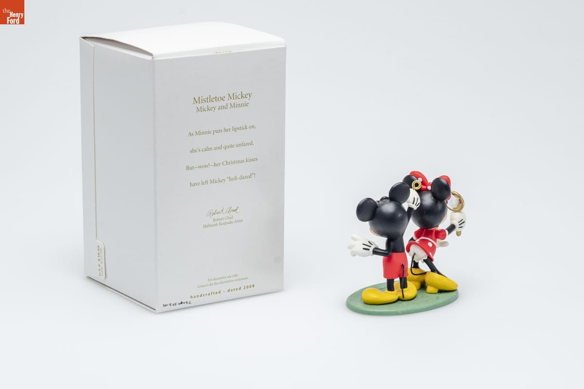 Mistletoe Mickey / Mickey and Minnie / As Minnie puts her lipstick on, / she's calm and quite unfazed. / But--wow!--her Christmas kisses / have left Mickey "holi-dazed"! / Robert Chad / Hallmark Keepsake Artist / For decorative use only. / Concu a des fins decoratives seulement. / handcrafted - dated 2009