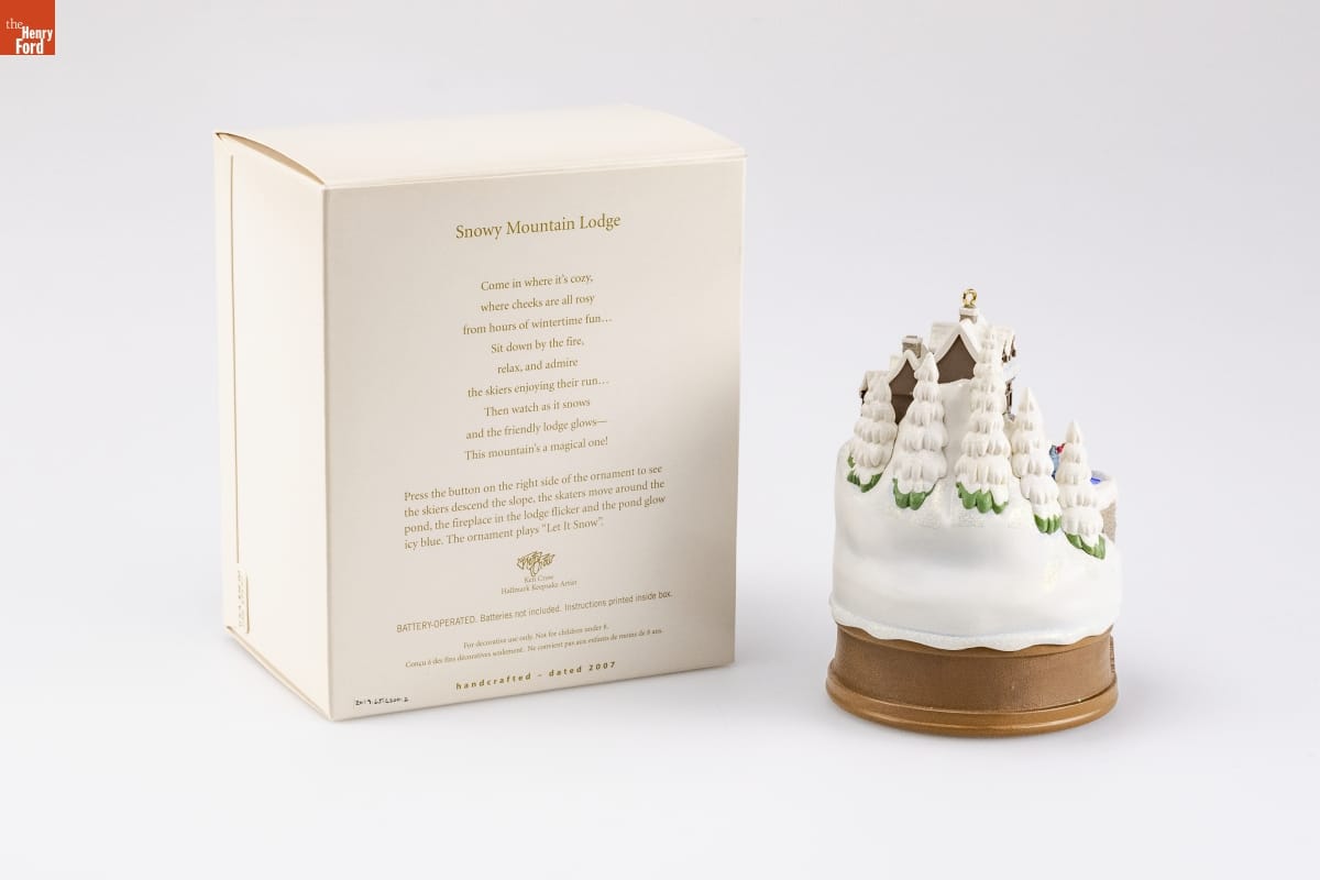 Snowy Mountain Lodge / Come in where it's cozy, / where cheeks are all rosy / from hours of wintertime fun... / Sit down by the fire, / relax, and admire / the skiers enjoying their run... / Then watch as it snows / and the friendly lodge glows-- / This mountain's a magical one! / Press the button on the right side of the ornament to see / the skiers descend the slope, the skaters move around the / pond, the fireplace in the lodge flicker and the pond glow / icy blue. The ornament plays "Let It Snow". / Ken Crow / Hallmark Keepsake Artist / BATTERY-OPERATED. Batteries not included. Instructions printed inside box. / handcrafted - dated 2007