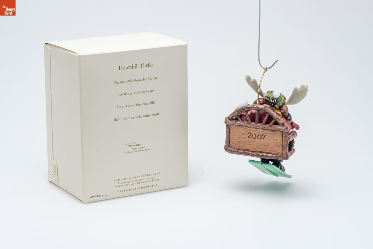 Downhill Thrills / Big and Little Moose both know / that skiing is the way to go-- / Up and down the snowy hill, / they'll share a special winter thrill! / Tracy Larsen / Hallmark Keepsake Artist / For decorative use only. Not for children under 8. / Concu a des fins decoratives seulement. / Ne convient pas aux enfants de moins de 8 ans. / handcrafted - dated 2007