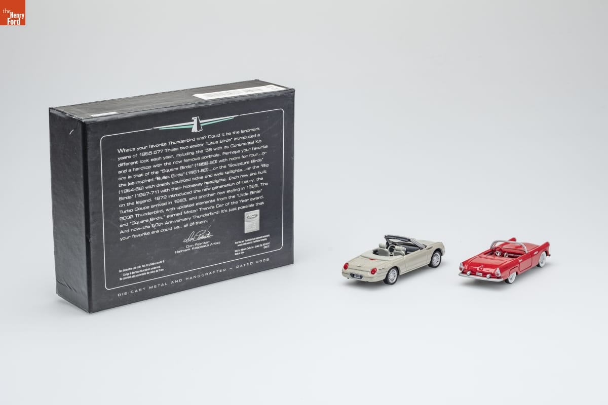 [Thunderbird logo] / What's your favorite Thunderbird era? Could it be the landmark / years of 1955-57? Those two-seater "Little Birds" introduced a / different look each year, including the '56 with its Continental Kit / and a hardtop with the now famous porthole. Perhaps your favorite / era is that of the "Square Birds" (1958-60) with room for four...or / the jet-inspired "Bullet Birds" (1961-63)...or the "Sculpture Birds" / (1964-66) with deeply sculpted sides and wide taillights. Each new era built / on the legend. 1972 introduced the new generation of luxury, the / Turbo Coupe arrived in 1983, and another new styling in 1988. The / 2002 Thunderbird, with updated elements from the "Little Birds" / and "Square Birds," earned Motor Trend's Car of the Year award. / And now - the 50th Anniversary Thunderbird! It's just possible that / your favorite era could be...all of them. / Don Palmiter / Hallmark Keepsake Artist / [Ford logo] / OFFICIAL / LICENSED / PRODUCT / Ford Oval and Thunderbird are registered trademarks / owned and licensed by Ford Motor Company. / For decorative use only. Not for children under 8. / Concu a des fins decoratives seulement. / Ne convient pas aux enfants de moins de 8 ans. / Mfd. for Hallmark Cards, Inc. Kansas City, MO 64141 / Made in China QXI6172 / DIE-CAST METAL AND HANDCRAFTED - DATED 2005