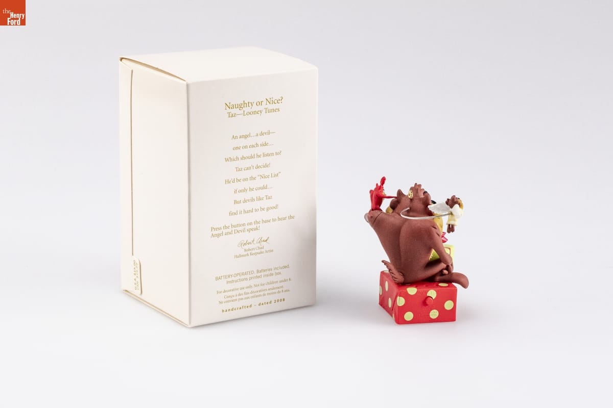 Naughty or Nice? / Taz--Looney Tunes / An angel...a devil-- / one on each side... / Which should he listen to? / Taz can't decide! / He'd be on the "Nice List" / if only he could... / But devils like Taz / find it hard to be good! / Press the button on the base to hear the / Angel and Devil speak! / Robert Chad / Hallmark Keepsake Artist / BATTERY-OPERATED. Batteries included. / Instructions printed inside box. / For decorative use only. Not for children under 8. / Concue a des fins decoratives seulement. / Ne convient pas aux enfants de moins de 8 ans. / handcrafted - dated 2008