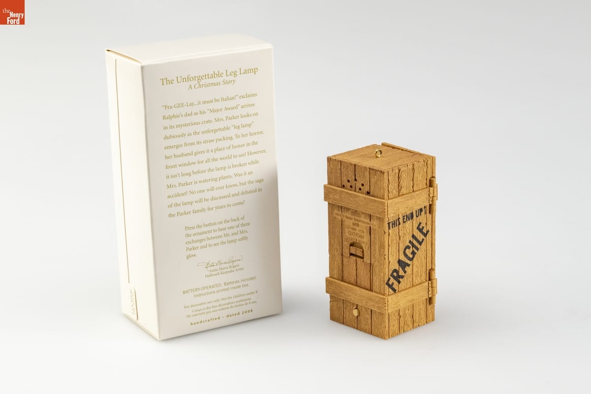 The Unforgettable Leg Lamp / A Christmas Story / "Fra-GEE-Lay...it must be Italian!" exclaims / Ralphie's dad as his "Major Award" arrives / in its mysterious crate. Mrs. Parker looks on / dubiously as the unforgettable "leg lamp" / emerges from its straw packing. To her horror, / her husband gives it a place of honor in the / front window for all the world to see! However, / it isn't long before the lamp is broken while / Mrs. Parker is watering plants. Was it an / accident? No one will ever know, but the saga / of the lamp will be discussed and debated in / the Parker family for years to come! / Press the button on the back of / the ornament to hear one of three / exchanges between Mr. and Mrs. / Parker and to see the lamp softly / glow. / Anita Marra Rogers / Hallmark Keepsake Artist / BATTERY-OPERATED. Batteries included. / Instructions printed inside box. / For decorative use only. Not for children under 8. / Concu a des fin decoratives seulement. / Ne convient pas aux enfants de moins de 8 ans. / handcrafted - dated 2008