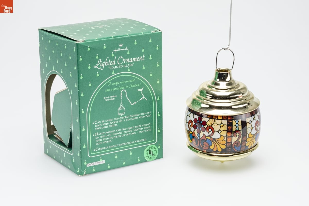 [TM] / Hallmark / Lighted Ornament / "STAINED GLASS" / A unique new ornament - / adds a special glow to Christmas! / 6-inch hookup / (included) / CAN BE EASILY AND QUICKLY PLUGGED INTO ANY / LIGHT BULB SOCKET ON A STANDARD MINIATURE / TREE LIGHT SYSTEM. / HANDY HOOKUP AND TWO LIGHT BULBS INCLUD- / ED. (SIX- INCH HOOKUP ALLOWS LIGHTED ORNA- / MENT TO HANG FREELY ON THE TREE - AWAY FROM / LIGHT STRING.) / COMPLETE DISPLAY INSTRUCTIONS ENCLOSED.