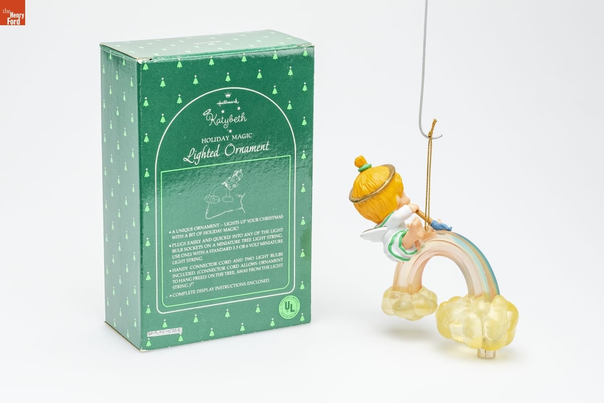 [TM] / Hallmark / Katybeth / HOLIDAY MAGIC / Lighted Ornament / A UNIQUE ORNAMENT - LIGHTS UP YOUR CHRISTMAS / WITH A BIT OF HOLIDAY MAGIC! / PLUGS EASILY AND QUICKLY INTO ANY OF THE LIGHT / BULB SOCKETS ON A STANDARD MINIATURE TREE LIGHT STRING. / USE ONLY WITH A STANDARD 3.5 OR 6 VOLT MINIATURE / LIGHT STRING. / HANDY CONNECTOR CORD AND TWO LIGHT BULBS / INCLUDED. (CONNECTOR CORD ALLOWS ORNAMENT / TO HANG FREELY ON THE TREE - AWAY FROM THE LIGHT / STRING.) / COMPLETE DISPLAY INSTRUCTIONS ENCLOSED.