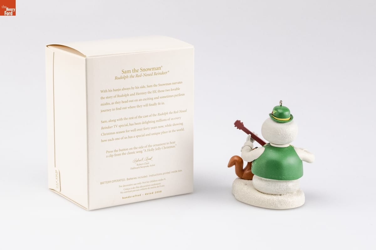 Sam the Snowman(R) / Rudolph the Red-Nosed Reindeer(R) / With his banjo always by his side, Sam the Snowman narrates / the story of Rudolph and Hermey the Elf, those two loveable / misfits, as they head out on an exciting and sometimes perilous / journey to find out where they will finally fit in. / Sam, along with the rest of the cast of the Rudolph the Red-Nosed / Reindeer TV special, has been delighting millions of us every / Christmas season for well over forty years now, while showing / how each one of us has a special and unique place in the world. / Press the button on the side of the ornament to hear / a clip from the classic song "A Holly Jolly Christmas." / Robert Chad / Hallmark Keepsake Artist / BATTERY-OPERATED. Batteries included. Instructions printed inside box. / For decorative use only. Not for children under 8. / Concue a des fins decoratives seulement. / Ne convient pas aux enfants de moins de 8 ans. / handcrafted - dated 2008
