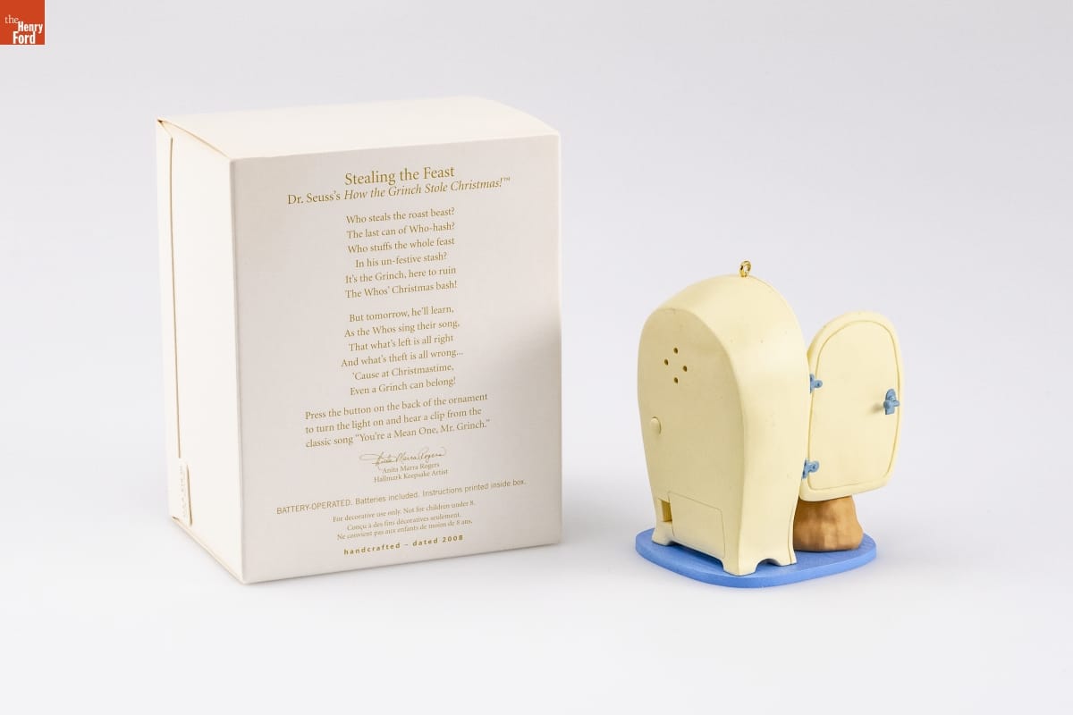 Stealing the Feast / Dr. Seuss's How the Grinch Stole Christmas! TM / Who steals the roast beast? / The last can of Who-hash? / Who stuffs the whole feast / In his un-festive stash? / It's the Grinch, here to ruin / The Whos' Christmas bash! / But tomorrow, he'll learn, / As the Whos sing their song, / That what's left is all right / And what's theft is all wrong... / 'Cause at Christmastime, / Even a Grinch can belong! / Press the button on the back of the ornament / to turn the light on and hear a clip from the / classic song "You're a Mean One, Mr. Grinch." / Anita Marra Rogers / Hallmark Keepsake Artist / BATTERY-OPERATED. Batteries included. Instructions printed inside box. / For decorative use only. Not for children under 8. / Concue a des fins decoratives seulement. / Ne convient pas aux enfants de moins de 8 ans. / handcrafted - dated 2008