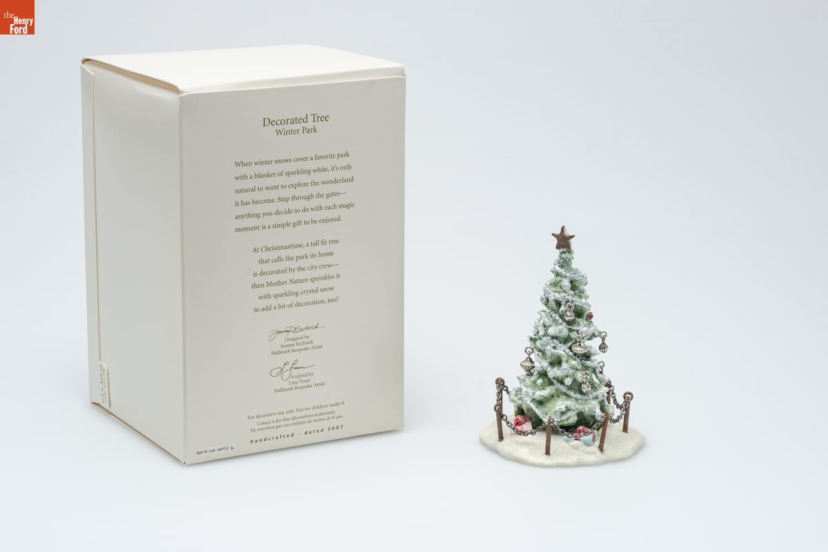 Decorated Tree / Winter Park / When winter snows cover a favorite park / with a blanket of sparkling white, it's only / natural to want to explore the wonderland / it has become. Step through the gates-- / anything you decide to do with each magic / moment is a simple gift to be enjoyed. / At Christmastime, a tall fir tree / that calls the park its home / is decorated by the city crew-- / then Mother Nature sprinkles it / with sparkling crystal snow / to add a bit of decoration, too! / Designed by / Joanne Eschrich / Hallmark Keepsake Artist / Sculpted by / Lane Feuer / Hallmark Keepsake Artist / For decorative use only. Not for children under 8. / Concu a des fins decoratives seulement. / Ne convient pas aux enfants de moins de 8 ans. / handcrafted - dated 2007