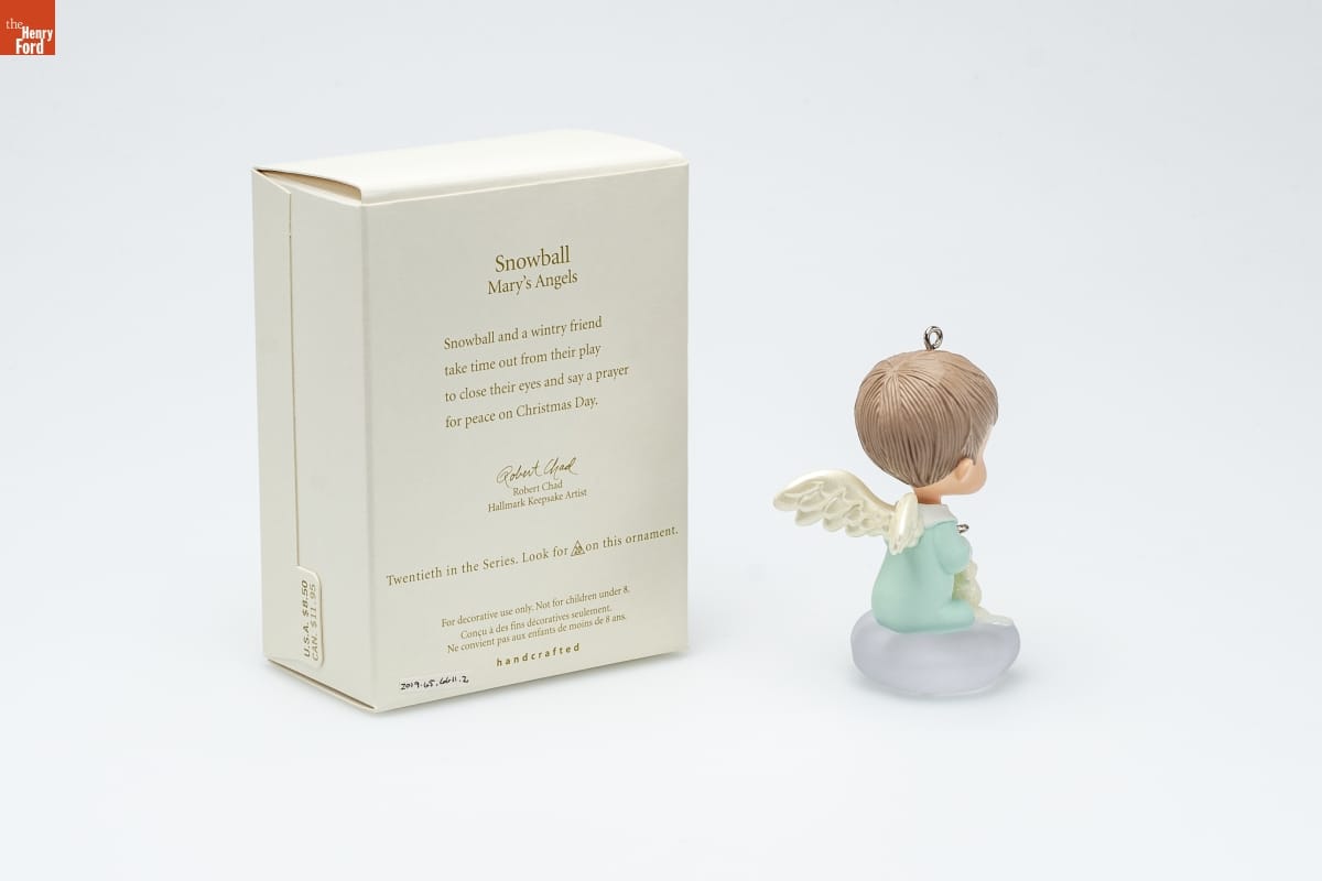Snowball / Mary's Angels / Snowball and a wintry friend / take time out from their play / to close their eyes in prayer / for peace on Christmas Day. / Robert Chad / Hallmark Keepsake Artist / Twentieth in the Series. Look for 20 on this ornament. / For decorative use only. Not for children under 8. / Concu a des fins decoratives seulement. / Ne convient pas aux enfants de moins de 8 ans. / handcrafted
