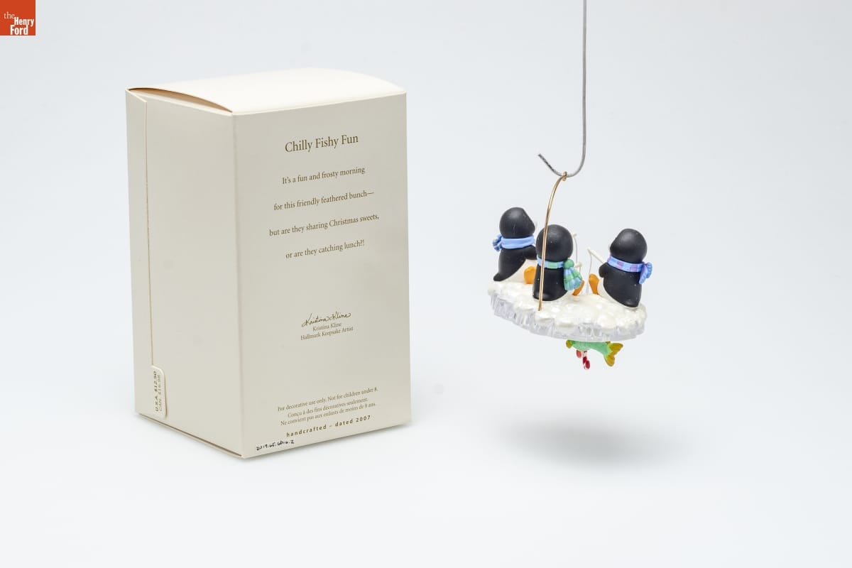 Chilly Fishy Fun / It's a fun and frosty morning / for this friendly feathered bunch-- / but are they sharing Christmas sweets, / or are they catching lunch? / Kristina Kline / Hallmark Keepsake Artist / For decorative use only. Not for children under 8. / Concu a des fins decoratives seulement. / Ne convient pas aux enfants de moins de 8 ans. / handcrafted - dated 2007