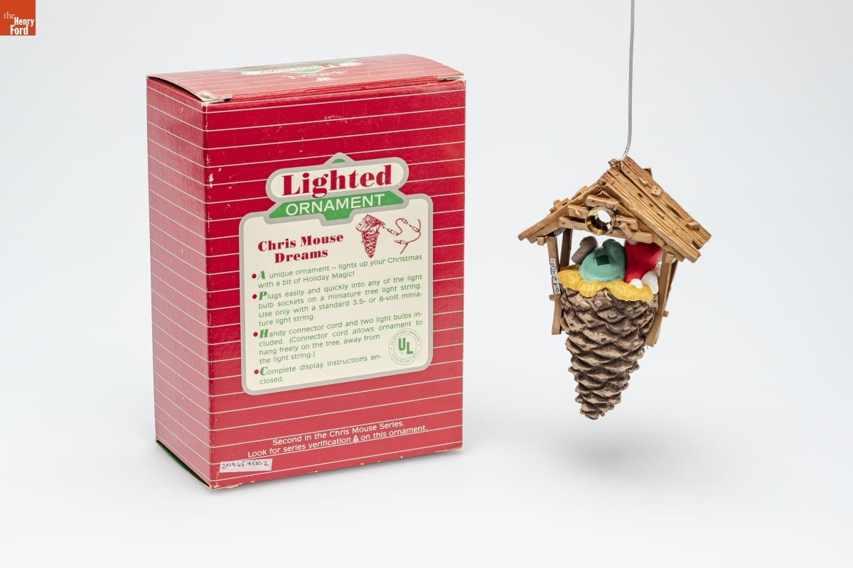 Lighted / ORNAMENT / Chris Mouse / Dreams / A unique ornament - lights up your Christmas / with a bit of Holiday Magic. / Plugs easily and quickly into any of the light / bulb sockets on a miniature tree light string. / Use only with a standard 3.5- or 6-volt mina- / ture light string. / Handy connector cord and two light bulbs in- / cluded. (Connector cord allows ornament to / hang freely on the tree, away from / the light string.) / Complete display instructions en- / closed / Second in the Chris Mouse Series. / Look for series verification 2 on this ornament.