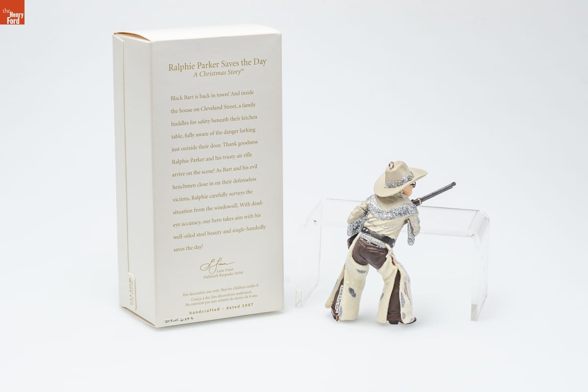 Ralphie Parker Saves the Day / A Christmas Story [TM] / Black Bart is back in town! And inside / the house on Cleveland Street, a family / huddles for safety beneath their kitchen / table, fully aware of the danger lurking / just outside their door. Thank goodness, / Ralphie Parker and his trusty air rifle / arrive on the scene! As Bart and his evil / henchman close in on their defenseless / victims, Ralphie carefully surveys the / situation from the windowsill. With dead- / eye accuracy, our hero takes aim with his / well-oiled steel beauty and single-handedly / saves the day! / Lane Feuer / Hallmark Keepsake Artist / For decorative use only. Not for children under 8. / Concu a des fins decoratives seulement. / Ne convient pas aux enfants de moins de 8 ans. / handcrafted - dated 2007