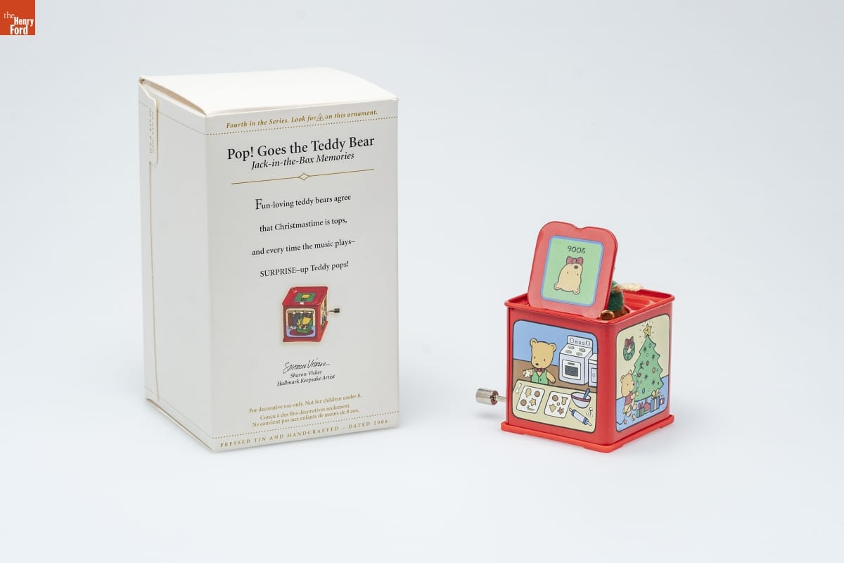 Fourth in the Series. Look for 4 on this ornament. / Pop! Goes the Teddy Bear / Jack-in-the-Box Memories / Fun-loving teddy bears agree / that Christmastime is tops, / and every time the music plays-- / SURPRISE--up Teddy pops! / Sharon Visker / Hallmark Keepsake Artist / For decorative use only. Not for children under 8. / Concu a des fins decoratives seulement. / Ne convient pas aux enfants de moins de 8 ans. / PRESSED TIN AND HANDCRAFTED - DATED 2006