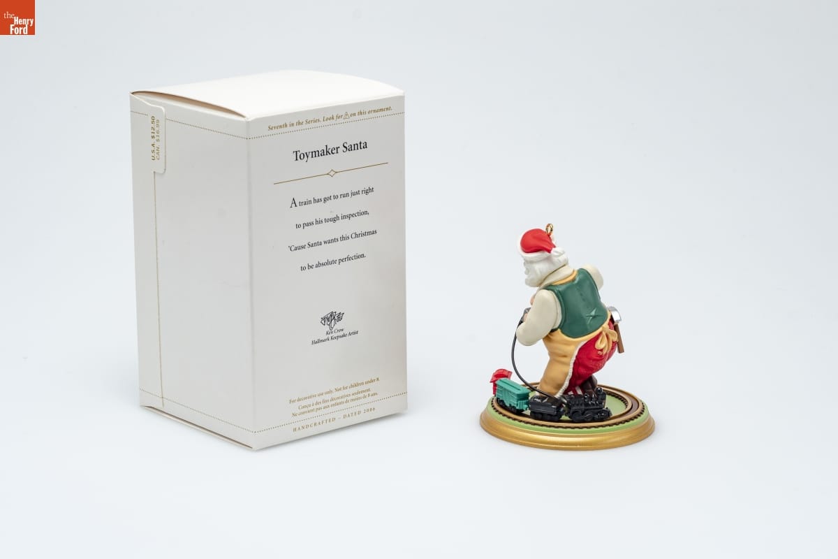 Seventh in the Series. Look for 7 on this ornament. / Toymaker Santa / A train has got to run just right / to pass his tough inspection, / 'Cause Santa wants this Christmas / to be absolute perfection. / Ken Crow / Hallmark Keepsake Artist / For decorative use only. Not for children under 8. / Concu a des fins decoratives seulement. / Ne convient pas aux enfants de moins de 8 ans. / HANDCRAFTED - DATED 2006